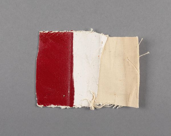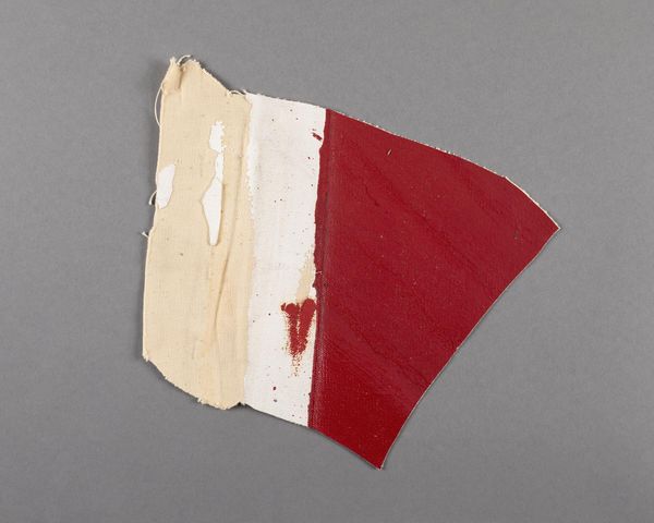 Curator: Immediately, I see such tenderness in the starkness! It's raw, like a forgotten piece of a larger, bolder dream. Editor: We’re looking at "Painted canvas fragment," a small work by Barnett Newman, located here at the Harvard Art Museums. The rough edges, the weave of the canvas, the deliberate red against the raw material—it all points to a very specific engagement with materiality. Curator: It feels intensely personal though, almost like a discarded thought, a moment of pure expression that just happened to land on a scrap. The red is so visceral. Editor: Exactly! That application of paint, its thickness, the way it interacts with the fibers—it's about the physical act of painting as much as it is about any symbolic content. The scale invites such intimacy. Curator: It’s like a whisper of rebellion, a tiny defiant act on a grand scale. Imagine the larger canvas it came from, then this small piece with so much energy. Editor: And the unprimed canvas begs us to consider the economic realities of art production, the ready-made versus the carefully prepared, and the art world’s valuation of each. Curator: So, is it a statement? Or just a beautiful accident, a lucky fragment? Editor: Perhaps both, intertwined. Looking at this fragment, it underscores the value in examining what’s often overlooked. Curator: It gives me permission to embrace imperfection.