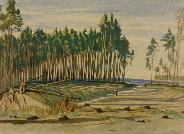 Curator: This landscape, rendered in charcoal, draws the eye immediately with its contrasting tones. Levitan created it in 1892, offering us a glimpse into his exploration of Russian nature. Editor: Somber, wouldn’t you say? The sharp charcoal work gives a stark feeling to the trees and open spaces. Almost like looking into a forgotten memory. Curator: Interesting choice of words! This work falls within the post-Impressionist movement, yet echoes a strain of romanticism characteristic of late 19th-century Russian art, particularly its engagement with national identity through landscape. Did landscape serve more than just aesthetic purposes? Editor: It makes me think about how public parks and views, once only available to aristocracy, were starting to shape the experience for the wider society, allowing citizens to participate in their nation through spaces that they had previously been excluded from. Curator: Precisely! Consider the vantage point Levitan selected: we are positioned alongside a worn bench, an invitation perhaps for any member of the rising merchant class, or urban professional to partake in an experience of serene contemplation in their natural surroundings. Editor: Levitan’s style feels urgent in its rendering, perhaps echoing a changing social reality for everyday Russians, as he witnessed that historical transformation and poured the weight of his era directly into these charcoal strokes. But I must add, seeing those dark looming trees makes me want to quickly turn back to the familiar warmth of inside, the modern lights! Curator: It captures something real about the shifting moods of the late nineteenth century. Even in natural imagery, you catch undertones reflecting new social realities. It makes me think—where do our perceptions of nature and nation truly overlap, even today? Editor: True. In these landscape sketches, art offers itself to us as an accessible witness.