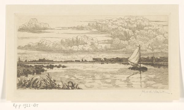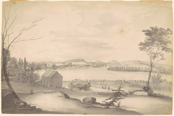 Curator: This pencil drawing practically whispers calm, doesn't it? Editor: It's incredibly serene, a quiet almost mournful beauty. I'm immediately drawn to the expansiveness, and that soft light—or absence thereof—contributes to the almost monochrome feel. Curator: What we're looking at here is "View of a Wide Body of Water in the Mountains with Figures in the Foreground" by Johan Eric Rehn, dating back to 1763. Editor: Rehn. Yes, I see the beginnings of Romanticism peeking through! Look at the way he's framed that vista. Those figures in the foreground, so small in comparison. It emphasizes the immensity, the untamed nature… there’s this… subtle alienation? A confrontation with the sublime, perhaps? Curator: The composition, absolutely. And notice how Rehn uses that gentle gradation of tone to suggest depth— it pulls you right in. And the figures on the dock, seemingly just enjoying a day of fishing, provide a comforting counterpoint. He's really playing with balance here. It is a very human scene too, a romantic idyll, maybe. I think that the artist, the art is longing for something. Do you feel that? Editor: You feel the longing because the light, and tonal ranges of the artwork are muted. So, you do not have the boldness of life. There is longing, because things are out of reach... because life's vitality is beyond your fingers. What he's doing with this limited tonal range is fascinating. Notice that contrast there is almost negligible! What is there is the way light glints off the water creating texture and depth. Curator: And his mark-making! Quick, sketch-like strokes that add this incredible feeling of movement, especially to the water and those clouds above... He certainly knew how to control his medium and create some life even though it's rendered so quietly. What a stunning glimpse of eighteenth-century quietude, isn’t it? Editor: Quietude indeed. A thoughtful meditation, both on the grandeur of nature, and the human experience within it. A good piece to spend a quiet moment with, and find one’s own meanings.