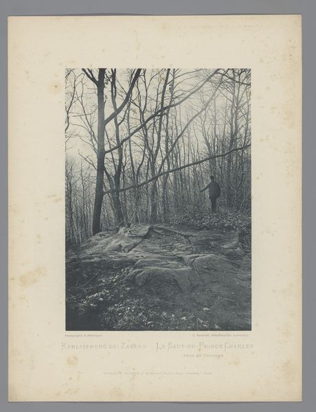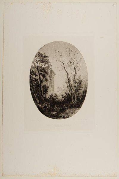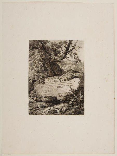 Curator: This is "Springtime in the Woods," an etching by John Henry Hill. I'm drawn to the intricate details captured in this seemingly simple woodland scene. Editor: It's visually quite dense, almost claustrophobic, with that strong vertical emphasis of the central tree trunk. One might wonder about the limitations of monochrome printmaking. Curator: Absolutely, and yet that limitation focuses our attention on the materiality of the print itself and the labor involved. How does the artist portray nature, and how does that relate to societal views of nature in his time? Editor: For sure. The flowing water at the base, and the dense foliage seem to speak to a certain type of labor, perhaps leisure, for those who had access to the country side. Curator: It encourages us to reflect on both the historical context and our present relationship with nature. Editor: Indeed, I'm left pondering how our contemporary concerns about environmental sustainability might inform our reading of this tranquil scene.