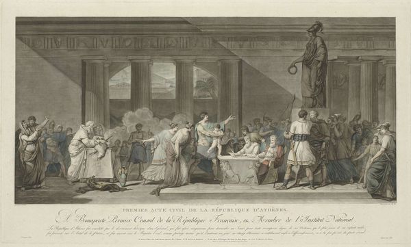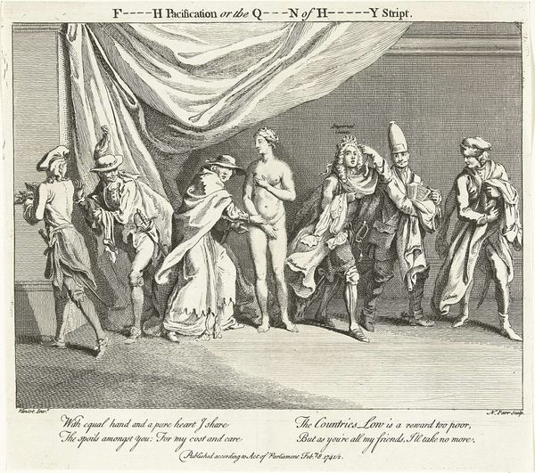 Curator: I'm immediately drawn to the dense, intricate line work. The texture of the engraving itself creates a palpable atmosphere within this interior scene. Editor: We’re looking at "The Redemption of the Firstborn," an engraving made circa 1720-1725. The Rijksmuseum attributes this piece to an anonymous artist. The scene presents a narrative, deeply embedded within the traditions and socio-cultural context of its time. Curator: Indeed. The composition leads the eye in a delightful dance—note the diagonal created by the gathering of figures, leading us toward the mother and child in the right corner. It has this sense of theatrical performance, reminiscent of baroque staging. Editor: Observe how the engraver depicts a relatively affluent setting, signified through the elaborate clothing and interior décor. It's intriguing to think about the social practice represented: the ritual of redeeming the firstborn, and what material value was assigned to this act. Curator: Exactly! The print is rich with detail, ripe for semiotic analysis. The mother, the gathering of men with hats, even the small details like the portrait hanging on the wall—every element contributes to a larger system of meaning. The opening door contrasts an open, enlightened way of life from what the people in the room want to accomplish. Editor: Consider too the technical skill. It took a great deal of expertise to transform the tangible ceremony to print. The artist had to capture subtle textures, and emotional nuance using just line and negative space. Think also of the network involved – from the printmaker to the distributors to those buying such prints: all participated in reinforcing specific power structures. Curator: I'm taken by the use of light and shadow, or perhaps its deliberate absence. The relative flatness, in the image, enhances a symbolic or iconic understanding that transcends naturalism, allowing this material object to transmit historical memory. Editor: Studying this engraving allows us to peek behind the curtains. It highlights material interactions and cultural expressions within a specific time period and social framework. Curator: An enigmatic engraving indeed. Editor: One that surely merits continued reflection.