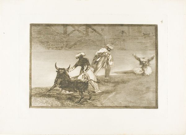 Curator: Goya's print, "Neither These," shows us a brutal scene. What strikes you right away? Editor: Darkness. It's a heavy, suffocating darkness. The figures almost melt into it, pulled down into despair. Curator: Goya's use of aquatint here is so powerful. He's not just depicting violence, but the mood around it. Editor: Exactly! It’s like the air itself is toxic, poisoned by what’s happening. It feels like a memory, a haunting afterimage of trauma. Curator: It certainly captures something universally troubling about human nature and conflict. Editor: Makes you wonder, doesn't it, what shadows lurk within us all.