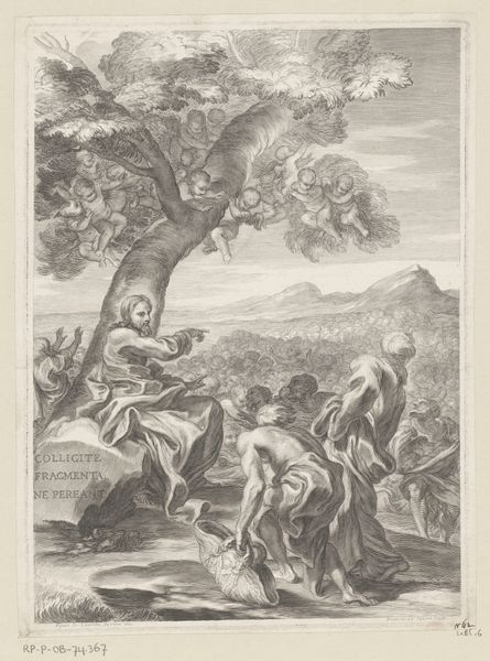 Curator: This is Maarten van Heemskerck’s “The Parable of the Good Samaritan,” an etching created in 1549. It's currently housed at the Metropolitan Museum of Art. Editor: Gosh, the mood is immediately bleak. Stark, even. The line work is so precise it feels almost…clinical. Curator: It’s certainly a departure from more romantic interpretations of the story. Heemskerck was working within a period of religious upheaval, though. Consider the socio-political context; the Reformation was reshaping artistic patronage and themes. Editor: I can see that. There’s a tension here. This isn’t just a straightforward Bible story. It's visceral. You feel the vulnerability of the figure on the ground. Curator: Precisely! Note how Heemskerck positions the victim centrally, almost foregrounded. It directs the viewer to confront human suffering directly. The landscape itself is harsh, mirroring the moral landscape. Editor: And those trees! They look almost gnarled with judgment. But there's a strange beauty in the composition, this dramatic use of light and shadow, pulling my eye around the scene... I almost missed the town in the background. Curator: Heemskerck used etching techniques popular at the time to create depth and texture, emphasizing the gritty realism of the scene, reflecting broader cultural debates about piety and action. Editor: It's funny, I initially thought it was just gloomy, but now I'm struck by how much hope is *actually* packed into this. A promise of kindness against the stark reality of abandonment, rendered so deftly by the artist. I love how Heemskerck doesn’t shy away from depicting brutality, while quietly hinting at the redemptive power of empathy. Curator: Well said. The parable’s enduring resonance rests, perhaps, in its ability to consistently invite fresh interpretations shaped by prevailing cultural forces. Editor: A stark and gorgeous meditation on human nature, expertly rendered! I'm heading for a strong cup of tea and a bit of personal reflection now. Thanks for that dive.