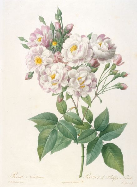 This botanical study of a 'Rosier de Provinsi a fleurs roses et simples' is a print on paper now held at the Minneapolis Institute of Art. Its composition is immediately striking, defined by a meticulous balance between the delicacy of its subject matter and the rigor of scientific observation. Note how the anonymous artist employs a limited color palette to emphasize the texture and form of the rose. The pink petals, rendered with subtle gradations of tone, contrast with the sharp, verdant leaves, creating a visual tension between softness and precision. This tension highlights the work’s structure. The careful arrangement of the plant parts draws our attention to its inherent geometry. The spiral arrangement of petals and leaves, together with the detailed depiction of thorns and veins, invites a semiotic reading of nature’s own structuring principles. In this way, the artwork transcends mere representation, offering a meditation on the underlying order of the natural world.