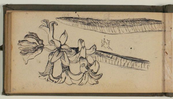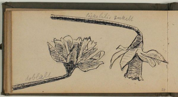 Curator: Looking at "Studies of flowers, including daffodils, with species indications" by Niels Larsen Stevns from 1919. It's rendered in ink on paper, a seemingly simple drawing. What strikes you most? Editor: The vulnerability, almost like a scientist's private, slightly clumsy notebook. I’m drawn to its lack of formality, that exposed line work. Does it give you that raw kind of feeling too? Curator: Definitely. The artist captures this idea through these spare lines, these quick impressions—daffodils in nascent form. I think these studies show Niels Larsen Stevns connection between observation and notation; drawing acts almost like labeling nature's catalog. Editor: Do you think he sees his work connected to a scientific lineage of natural study or something else, from what you know about the time, in social and political terms? I mean, I think it certainly communicates something on this more subtle personal dimension. Curator: During the early 20th century, the period that "Studies of flowers…" originates from, a strong artistic nationalist fervor was happening and affecting the field of visual production.. Artists often went outside academic settings in order to study real surroundings and environments—think plein air and naturalism which influenced that change! This may reveal this work—especially sketches such this work reflects desire or intention outside prescribed convention regarding proper forms for the work. Editor: True. So, with these botanic studies in line with a burgeoning nationalist perspective emerging within the Danish arts—do these humble illustrations signify themes linked closely linked its society back around then when thinking both environmentally but also regarding heritage? In light's historical framework like environmental and culture change? How the culture changed society—and cultural expressions which this shows this. Curator: I think you’re on to something! A daffodil could carry immense cultural value within this nationalist setting perhaps… Editor: Right. I will appreciate a humble flower drawing. Curator: Me too!