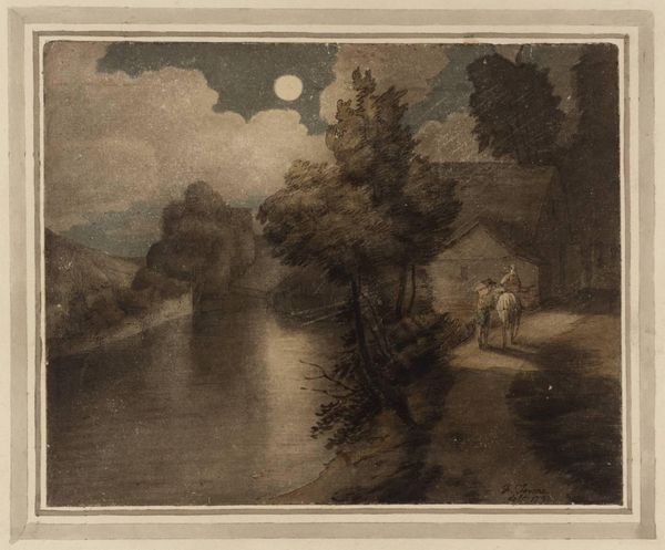 Editor: Here we have "Building by the River in Moonlight," a drawing in ink on paper by Johann Ludwig Ernst Morgenstern, part of the Städel Museum collection. I'm immediately drawn to the contrasting dark and light values, the stark difference between the sky and the ground, which gives it this eerie, romantic quality. What’s your perspective on this piece? Curator: What I find interesting is how this seemingly tranquil landscape can be read against the backdrop of its time. Think about the burgeoning industrial revolution—the stark contrast between the romanticized natural world here, depicted with a clear mastery over ink wash, and the rapid urbanization transforming society. Editor: So, is this perhaps a subtle critique of industrialization? Curator: It could be. Or a longing for something lost. Consider how the figure by the river appears isolated. Is that a representation of an individual detached from community because of new social structures that elevated capital? Look closely, it's a deliberate arrangement—perhaps an argument about humanity's alienation from nature and from itself as societal norms rapidly transformed. What emotions does the figure evoke in you? Editor: Definitely a sense of loneliness, or introspection. Now I can see a layer of social commentary that I initially missed. It goes beyond just a pretty picture. Curator: Precisely. This artist is placing nature in dialogue with the societal shifts that might threaten its very existence. The romantic elements make it deeply political when seen in this context. It provokes questions about progress and what it truly means. Editor: I now see it's much more than a pretty landscape, the artist’s technique supports their expression, and gives space to the viewer's reflection! Thank you! Curator: And thank you. Considering art with such historical awareness helps make its relevance even clearer to contemporary audiences.