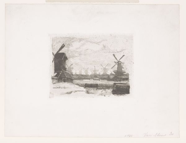 Robert Mols created this small etching called 'Molen aan het water', or 'Mill by the Water' during the late 19th century, a period defined by rapid industrialization, urbanization, and a growing interest in landscape as a symbol of national identity. Mols, like many of his contemporaries, turned to the countryside for inspiration, seeking refuge from the changing world. In the 19th century, windmills were not just industrial structures, they also held a profound cultural significance, embodying the spirit of Dutch ingenuity and perseverance. They became powerful symbols in art and literature, representing an idealized version of rural life. Notice how Mols used the etching technique to create a sense of depth and texture in the landscape. This speaks to the nostalgia for a pre-industrial past, suggesting a longing for simpler times. The mill, standing against the horizon, evokes a sense of solitude, reflecting the emotional complexities of a society undergoing radical transformation. It reminds us of the human connection to the environment.
