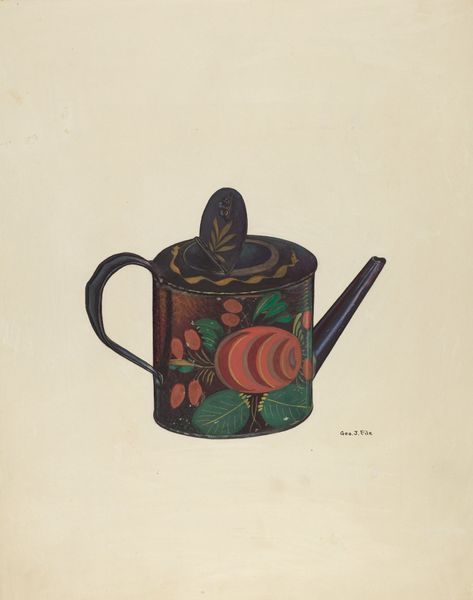 Curator: Okay, so we're looking at Lillian Causey's "Mug," dating roughly from 1935 to 1942, created with drawing and watercolor. And, goodness, it’s a sweet little thing. Editor: It gives off such a whimsical vibe, almost like a page torn from a well-loved fairytale. The delicacy of the watercolor makes the light filter through the mug beautifully. Curator: Absolutely! It’s not just a mug; it's a stage. Note the little narrative Causey's painted around the glass. Tiny buildings, spires maybe, amidst these playful, almost folk-art floral flourishes. Editor: And consider how she captures the materiality of the glass itself. There’s a remarkable transparency achieved with just the subtlest washes of color. You can almost feel its cool, smooth surface. Curator: Yes, the way she handles light and shadow is wonderful. And the choice of the aged, toned paper stock gives it this gentle warmth, as if the object exists just slightly out of reach in the sepia tones of a fondly-recalled memory. What stories might this vessel hold, do you think? Was it on her table, perhaps souvenir from somewhere special, Moscow maybe? Editor: I see what you mean. It’s more than just a study; there’s a distinct sense of intimacy. Though the object itself is rather commonplace, the artistic touch elevates it, doesn't it? Curator: Precisely. And despite being rendered in what could be considered a casual medium—sketch, watercolor—there’s still such meticulous detail in the execution of each brushstroke and mark, this tension is everything in Causy's works! Editor: It's an interesting combination. There's that sense of spontaneity but a controlled and precise application of the watercolour— I agree that is is indeed the key! Well, I've suddenly got a fierce craving for a hot chocolate...or maybe just some nice cool water! Curator: It almost has that effect on the soul. Just makes you want to contemplate simplicity. It’s amazing what depth a simple sketch of everyday item, a mug no less, can stir.