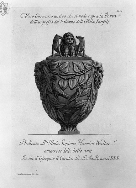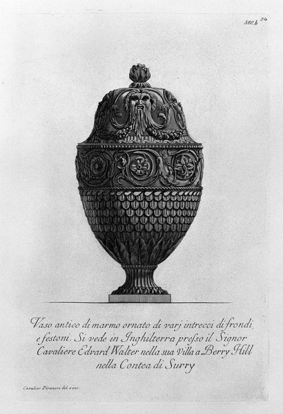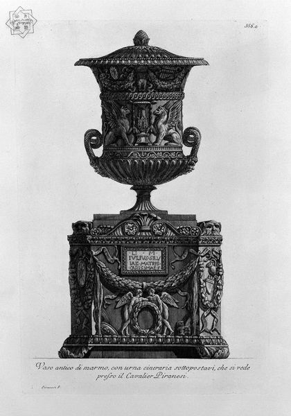 Editor: This etching by Giovanni Battista Piranesi showcases an antique marble vase, embellished with scenes of figures and hippogryphs. The print focuses on form. It has an incredibly detailed design, all rendered in monochrome. How would you interpret this work within its historical context? Curator: Piranesi wasn’t simply documenting ancient artifacts; he was actively shaping perceptions of Roman grandeur. This print, like much of his work, participates in the 18th-century debate about the relative merits of Greek versus Roman art and architecture. It’s not just about the vase itself, but about promoting a particular vision of Roman cultural authority. Notice the text within the engraving. What does it signify to you? Editor: The Latin inscription in the center? It appears to be dedicatory or commemorative. So you’re saying that Piranesi’s etchings played a role in constructing a specific narrative about Roman power and influence during his time? Curator: Precisely. He used his artistic skill and printing technology to circulate images of Roman artifacts – often idealized or even imagined reconstructions – thereby influencing contemporary taste and fueling a market for all things Roman. Think of it as visual propaganda, if you will, designed to evoke a sense of awe and admiration for Roman civilization. His views of the Colosseum, for example, helped shape how generations viewed and understood Roman history. The composition also reveals an artist emphasizing the sheer spectacle of Rome's historical objects. Do you think the framing draws attention to anything specifically? Editor: I guess it puts emphasis on the grand scale of the object and hints at an important history surrounding Roman power! So, the focus is less on strict archaeological accuracy and more on crafting a powerful visual argument? Curator: Exactly. It highlights how art becomes enmeshed within larger socio-political dialogues, shaping cultural memory and national identity. Editor: That's a fascinating perspective. I hadn't considered the active role these images played in shaping perceptions of Rome. Thanks! Curator: It’s a good reminder that even seemingly objective documentation can be a powerful form of interpretation and persuasion.