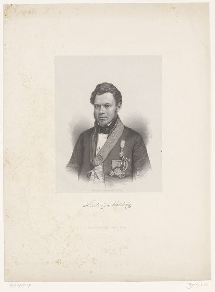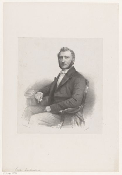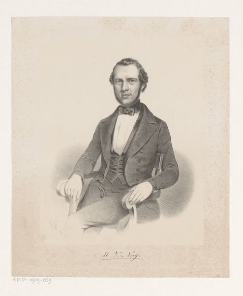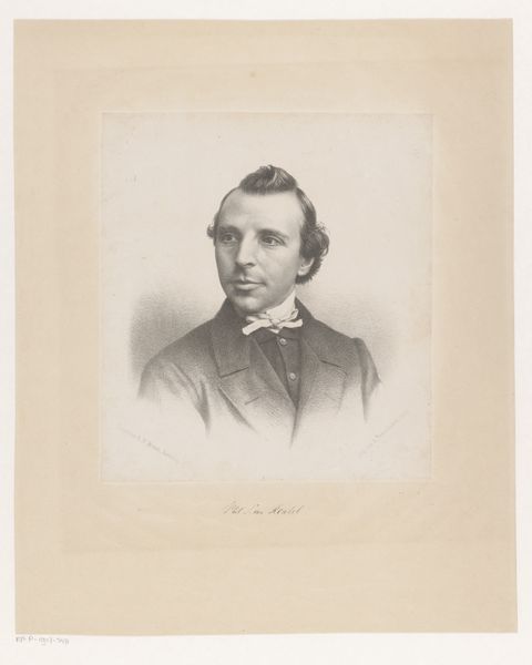 Curator: This is a print of a graphite drawing. The piece, titled "Portret van Abraham Kuenen," dates roughly from 1843 to 1863, and the artist is Johan Hendrik Hoffmeister. Editor: The portrait gives off a stern vibe, even austere. I'm struck by the subject's penetrating gaze and the somber tones used throughout. It speaks of a person of significance, burdened perhaps by weighty thoughts. Curator: I agree. And when considering the method of production – a print based on a graphite drawing – it reveals an interesting tension between accessibility and high art. Prints allowed for wider circulation of images, democratizing access to portraiture that was formerly available only to the elite. How does that affect our perception of the sitter? Editor: It’s fascinating to consider the print as a deliberate echo of an ideal. Here, the symbols of mid-19th century intellectual authority are potent – look at his high collar, his neatly tailored suit. This image clearly intends to communicate respectability, anchoring Kuenen in a recognizable context of power and erudition. Curator: I’m interested in the process, in the labour. Graphite lends itself to fine detail. Here we see that in the rendering of Kuenen’s hair and the subtle textures of his clothing. Consider, also, the materiality of the print itself; what type of paper was used and what statement did it make? Editor: Beyond the tangible, consider what the print aims to transmit. Abraham Kuenen's presence has been translated into an object designed to hold specific associations. Think about what's absent: his profession, the nuances of his character, distilled to fit a pre-set format for a public that understands and values learnedness. Curator: Indeed. This work acts as both a commodity produced for consumption and a lasting record that informs us today about class and labour from the mid-19th century. It invites us to question how we produce and disseminate images of those we consider to be historically significant. Editor: So, from this exploration of image and matter, we gain a greater sense of how portraiture carries cultural meaning, from the careful manipulation of appearance to the deliberate appeal to long-held cultural values.