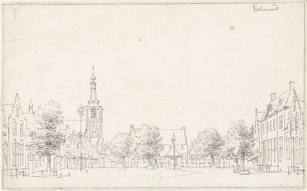 Curator: Elias Stark likely created this work, entitled "Straat in Amersfoort", around 1887. It’s a pen and ink drawing currently residing here at the Rijksmuseum. Editor: It strikes me as surprisingly austere. The lines are precise, almost architectural in their dryness. A stark stillness permeates the scene. Curator: Yes, Stark captures the townscape's rigid geometry, emphasizing the imposing architecture with such intricate linework, wouldn’t you say it evokes a certain somber atmosphere common in Dutch cityscapes of that era? Churches often serve as icons of the town or village. Editor: Indeed, and I wonder about the socio-economic forces that shaped Amersfoort then. This drawing likely represents a very specific, material reality for its inhabitants. Think about the source of the ink, the quality of the pen, even the paper – what class of artist would be using these materials and how does that affect representation? Curator: That’s an astute point. Beyond the depiction itself, understanding the materials brings the cultural landscape to life. The deliberate pen strokes forming the houses almost render them as icons. Do you agree? Editor: In a way. Each building represented by those strokes implies the labor and materials to produce it— the clay for the bricks, the wood for the frames, and the lives sustained within those walls. Stark reduces it to pure representational labour. Curator: So you’re suggesting that, while ostensibly depicting a place, the medium itself underscores a broader commentary on the economic infrastructure of that era. Editor: Exactly! It's less about an idealized vista and more about revealing the material processes underpinning urban life. It is worth studying to help us understand its contemporary cultural landscape. Curator: A compelling viewpoint, framing it as an exploration of process and materiality. It enriches our understanding of the drawing's significance and how we understand cultural representation through artwork. Editor: It seems we both see the landscape differently—a convergence of symbolism and raw material converging on this very interesting “Straat in Amersfoort”.