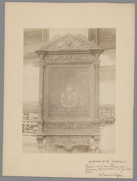 Curator: The work before us is a photograph of the Grafmonument van kardinaal Cristoforo della Rovere in de Santa Maria del Popolo te Rome, taken by James Anderson, sometime between 1857 and 1875. Editor: Woah, immediately I get this deep sense of peace and solemn quiet. The soft sepia tones, the intricate carving… it’s like stepping back into a hushed, sacred space. Curator: Anderson, as a photographer, was deeply interested in documenting artworks and architecture, and we should understand his pictures in their historical context. His images weren't just documentation, but often commissioned artworks, in a world where photography played an increasingly large role in art history itself. This image captures not just a monument, but its photographic representation. Editor: Absolutely, this image transcends documentation; it feels imbued with reverence. See the light catching the marble? And those angles! They give a sense of almost holy geometry... I am picturing the sculptor agonizing over every curve, every cherub's wing. It makes you think about mortality, doesn’t it? The cardinal is laid out, in stone now himself, waiting... Curator: Precisely. The Cardinal della Rovere was part of a very powerful family in the 15th and 16th centuries and played an important role in papal politics. A grand tomb wasn't just a memorial, it was also a statement of power and influence, reflecting both the family’s status and their continuing legacy through the church. Editor: Looking at the detailing, you sense a yearning for eternity, a desire to carve out a space in time... or beyond it! All the decoration, the details in marble are stunning. Did the photograph allow more people to contemplate the cardinal's legacy? To stand before the grand monument from afar? Curator: It is quite possible, although these images were often circulated amongst art historians and the wealthy classes at the time. The wide circulation among popular audiences hadn't quite taken off yet, but that role of democratizing art access became crucial soon afterwards, particularly through postcards. Editor: Thinking about those postcards now puts everything in context. Almost like souvenirs… Death goes to the masses! So many interpretations and levels to the original carving and monument; amazing the conversation all born from a picture. Curator: A fascinating collision of artistry and technology reflecting faith, power, and the evolving relationship between representation and reality in the Victorian era. Editor: A fitting end that feels right; makes me reflect about legacy... What will be captured about our time now for others to witness someday? Deep.
