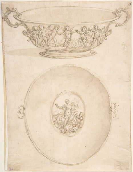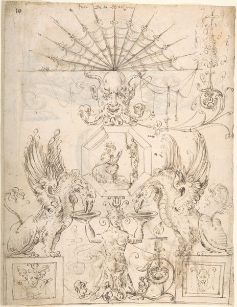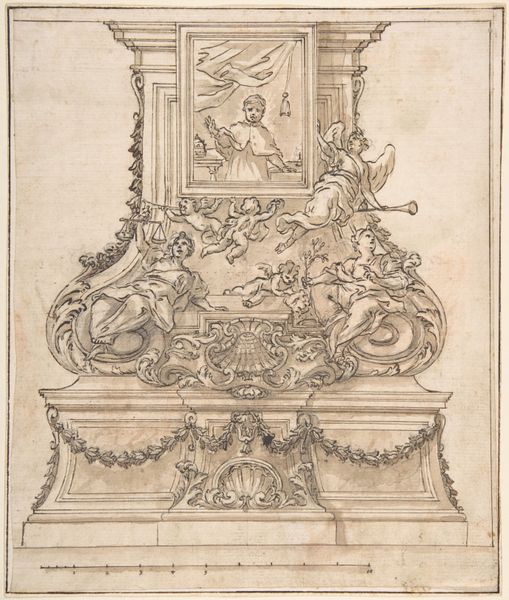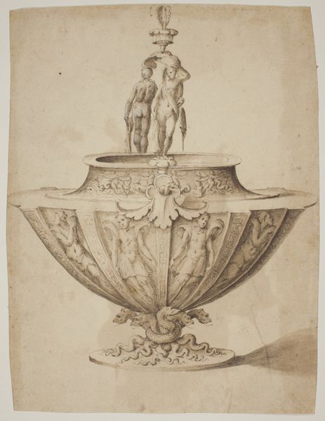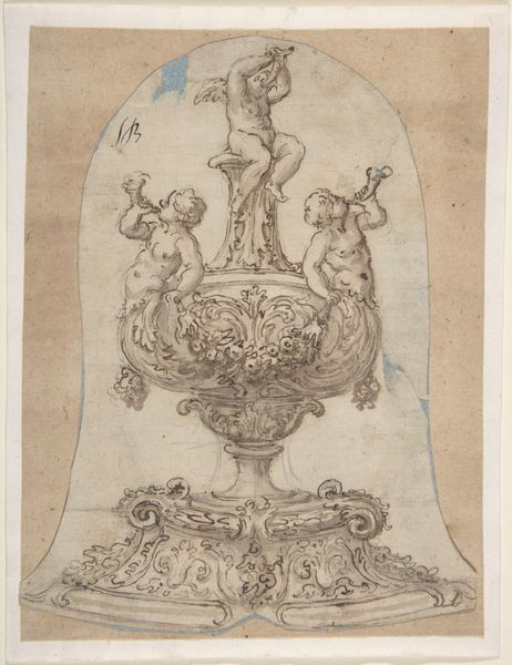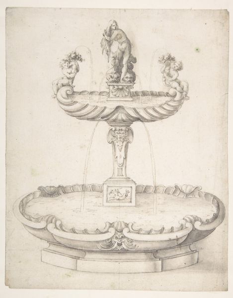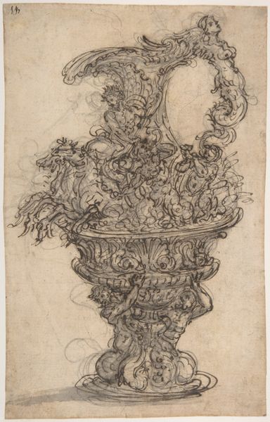 Curator: This drawing, currently residing at the Metropolitan Museum of Art, is attributed to Giovanni Battista Foggini. The piece is titled "Design for a Fountain with Two Water-Spouting Lions", created sometime between 1652 and 1725. Editor: There's a wonderful energy to it, despite being a preliminary sketch. The lions holding the urn have this heraldic, almost aggressive pose, balanced by the flowing lines of the fountain below. I imagine the real marble sculpture would be breathtaking. Curator: Absolutely, consider the interplay of line and volume. The rapid strokes delineate form but also imply texture, hinting at the opulence of the intended fountain. Note also the dynamic symmetry achieved through the carefully placed lions mirroring one another, a perfect symmetry. Editor: I am immediately drawn to the materials and techniques required for its physical realization. Consider the quarrying, carving, and finishing of the stone—the sheer amount of artisanal labor. It feels far removed from today's instant production processes. I would want to understand the precise geology of the marble and what types of tools were employed. Curator: Certainly, but it's also worth exploring how Foggini employs the classical language of the Baroque to communicate power and authority. The lion motif itself is highly symbolic, often representing strength and dominion. Look how these are combined in an artful rendering. Editor: Power expressed through material display. This fountain, should it have been realised, was clearly destined for a location, either public or private, where water, light, and reflections upon the stone’s surface could serve to amplify social distinctions and underscore ideas of luxury. One has to wonder about Foggini's client. Curator: Indeed. But let's not neglect its pure artistic achievement: a sketch that offers a glimpse into the design process of a major artist and is aesthetically satisfying in its own right. Editor: For me, this fountain is a beautiful reminder that an object has both a cultural and historical framework to illuminate its place within time.