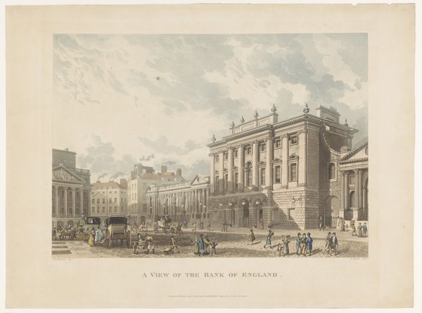 Curator: Here we have "View of the East India House, London," an engraving after 1800 by William H. Griggs. The work exemplifies Neoclassical aesthetics through its clean lines and orderly depiction of urban life. Editor: Immediately striking. The precision is quite appealing; it's all so meticulously rendered. There’s a real sense of depth achieved with delicate gradations of tone and the subdued color palette. It feels like a stage set for a very proper historical drama. Curator: Indeed. But the drawing speaks to more than just aesthetics. This print offers insights into the commercial infrastructure that shaped 19th-century Britain. East India House, the backdrop here, functioned as the nerve center for the East India Company—an entity that dramatically reshaped global trade networks. Consider the labor involved in its operation— the clerks, administrators, and laborers propping up this edifice. Editor: All the figures on the street look so anonymous though, almost generic, subservient to the overwhelming geometry of the buildings and the composition, do they not? Even the texture of the stonework— the perfectly placed lines of the window frames— seem to dominate the figures populating this vista. Curator: The company’s dominance hinged upon meticulous organization and regulated production, much like the engraving itself! The engraving process demands discipline; the artist carefully incising lines into a metal plate, which can then be replicated. A fitting method for representing the controlled world of British commerce. Editor: I grant you that. But to me, it is primarily a striking study in form, using its lines to emphasize geometry while the overall tone evokes a particular mood— restrained, elegant. Curator: Ultimately, this print is a document of how commercial power sought to represent itself, imbuing even its buildings with a sense of immutable grandeur through architecture and representation. Editor: A structure reflected flawlessly in the artist's choices, leading viewers toward an appreciation of architectural grandeur captured via tonal mastery.