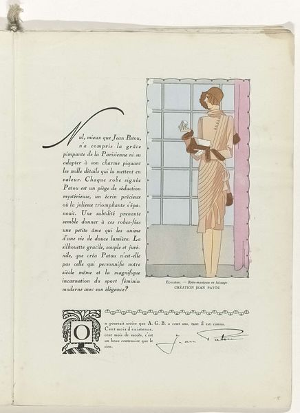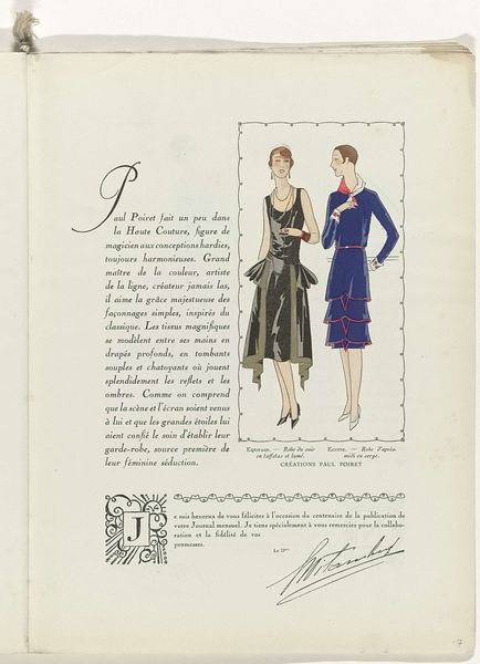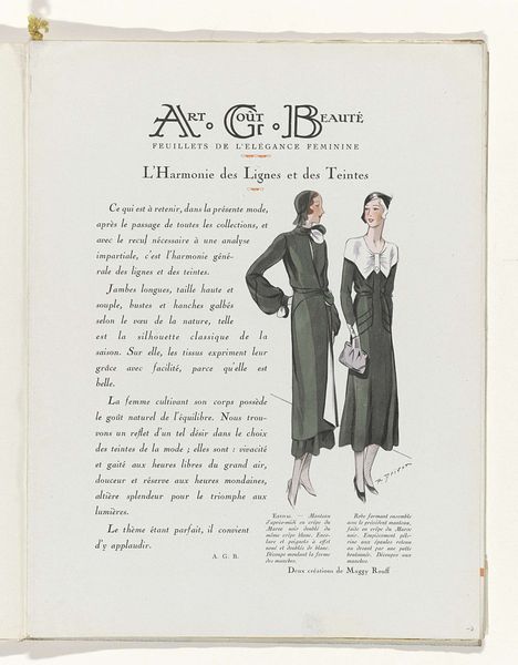 This page from "Art - Goût - Beauté" was made in November 1928 using printmaking. You know, the way the simple lines create these fashionable women and the interior space makes me think about how the image was constructed. It's all about the layering, isn't it? Look at how the different planes and textures of the fabrics are rendered with such sparse marks! The artist has made some simple and elegant lines, giving us just enough information to imagine the weight and drape of the fabric. I’m drawn to the pale yellow, almost cream, palette. It feels muted and reserved, yet hints at light and shadow, giving depth to the scene. See how it creates these subtle differences in tone? It’s all about process, each layer informing the next. The composition reminds me of some of David Hockney's set design work, like he's arranging figures in a stage set. Both artists share a playful and experimental approach to rendering space and form through color and line. It's just an ongoing conversation, this art thing. And of course, there's no one 'right' way to look at it!