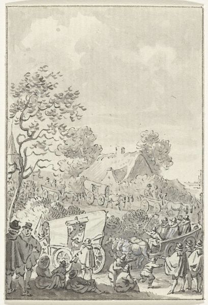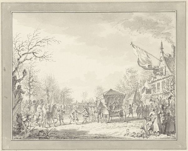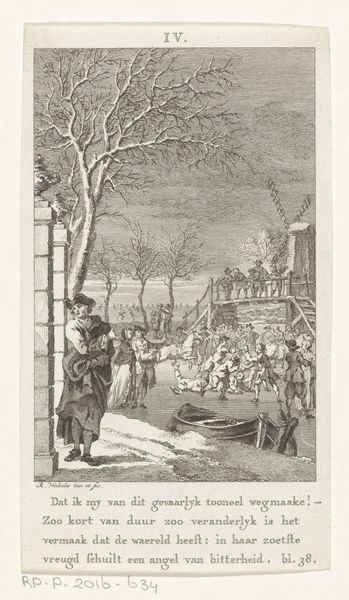 Editor: We're looking at Reinier Vinkeles's "Winter" from 1769, a pen and pencil drawing currently housed in the Rijksmuseum. It's a busy winter scene with people on a frozen body of water, and there’s an almost chaotic energy to the whole composition. What story do you think this piece tells? Curator: It’s a fascinating genre painting that reflects the social experience of winter in 18th-century Netherlands. Vinkeles gives us a glimpse into popular pastimes of the era, the kind accessible to a variety of social classes despite potential hazards of frozen waterways. Editor: Hazards? Curator: Well, yes. The inscription implies danger amid winter festivities; the joy of winter comes at a risk. This depiction raises the question of who gets to participate in the “fun” of winter activities? Are they shared by all social classes, or are they implicitly coded and controlled, similar to contemporary access to recreation and resources? Consider the presence of the windmill—a key element in Dutch landscape painting – symbolizing labor and potentially economic disparity set against leisure. Editor: I see. So, the picture isn't just showing a fun winter day; it is making some historical, perhaps even political comment, about equity through its visual elements. Curator: Precisely! This artwork can be interpreted as a window into the social dynamics and the layered complexities of leisure and danger within a specific time and place. The composition invites us to consider winter pastimes and their societal implications, similar to today’s images we see in public spaces and on social media. Editor: That definitely reframes the entire scene for me. I came in expecting a simple landscape, but I'm leaving with questions about power and access. Curator: And that is often the role of art: to not just please the eye, but provoke critical inquiry.