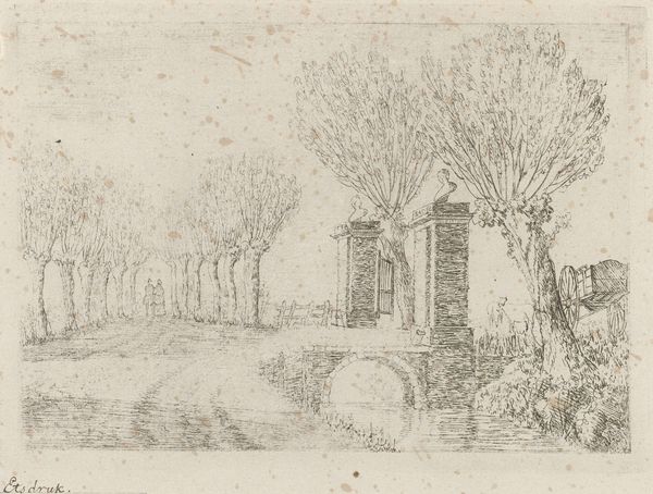 Editor: Oh, it's like a memory, fading into the sepia tones of time. Curator: Indeed. This is Richard Wilson's "Figures at a Shrine," and it invites us to consider how eighteenth-century artists looked back at classical ideals. Editor: There’s a contemplative mood… ruins, figures, a sense of the sacred in decay. It reminds me of pondering mortality, like a visual elegy. Curator: Wilson's Italianate landscapes often drew on ideas of the sublime, and we can see how even a modest drawing like this one gestures towards those broader themes of nature, history, and human significance. The figures, are they pilgrims, looters, or merely travelers? Editor: Perhaps they're us, searching for meaning amidst the fragments. I feel the urge to fill in the gaps with my own narrative. Curator: It’s a powerful invitation to reflect on our relationship with the past. Editor: Yes, art as a mirror reflecting our eternal human condition! Curator: Precisely.