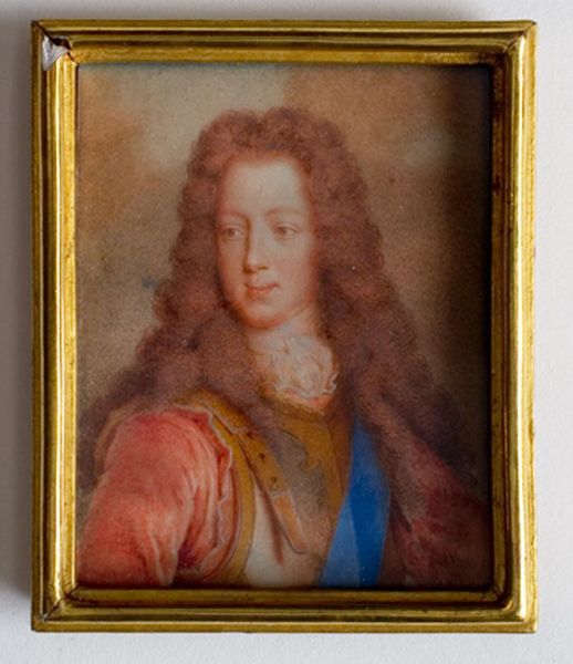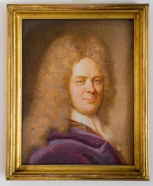 Editor: Here we have “Herreportræt,” or "Portrait of a Man", an oil painting made sometime between 1726 and 1748, attributed to David Gardelle. It’s currently hanging at the SMK in Copenhagen. The sheer volume of the wig really strikes me! How do you interpret this work? Curator: The visual interplay between the subject and frame is striking. Notice the oval composition nested within the circular frame: a subtle repetition that contains and amplifies the figure's presence. How does this structural choice inform your understanding of the portrait? Editor: Well, it makes me focus more on the face. I hadn't thought of it that way. The wig almost fights with the frame for dominance, but the painter's composition keeps the man’s face in control of the artwork. Curator: Precisely. Consider the Rococo style; its playful ornamentation never overshadows the underlying structure. Here, Gardelle masterfully orchestrates form and colour to capture not just a likeness, but a carefully constructed image that exudes aristocratic identity. Editor: The colours are quite muted, almost faded. Does that palette relate to its identity as a portrait? Curator: The limited palette draws our attention to tonal variations in the wig and coat. Gardelle employs a formal rigour within the genre. The very notion of capturing essence through structured visual means is worth examining, don't you agree? Editor: I do. Thinking about composition helps to better understand even a seemingly simple portrait. It makes me want to seek other portraits from the period to understand Gardelle's use of line and colour, the relationships between forms and structure. Curator: Indeed, comparative visual analysis yields great insight.