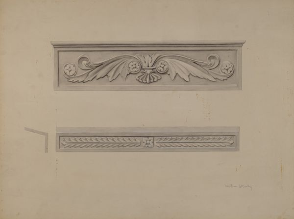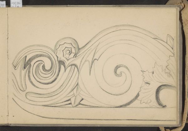 Curator: This is a drawing entitled "Scroll" by Max Fernekes, created in 1938 using watercolor and pencil. Editor: It has an oddly elegant, somber feel. Like a relic carefully rendered. The sepia tones and aged paper amplify that sense of preservation, even reverence. Curator: Interesting take. For me, it prompts questions about industrial design, particularly during the late 1930s. What sort of skilled labor was involved in crafting such detailed ornamental pieces? Was this a proposal, or simply a rendering of an existing artifact? The means of production is very suggestive here. Editor: Absolutely. But that spiraling scroll evokes something deeper for me – a sense of continuous return, perhaps echoing the cyclical nature of time itself. The way the tendrils unfurl, reminiscent of ancient Celtic knotwork. It’s an echo of classical forms filtered through a particular artistic sensibility. Curator: Right, I’m compelled by what the artifact represents about architectural design history of the period. How it might connect to contemporaneous economic challenges as the economy and manufacturing was transforming in this country. The medium employed suggests thoughtful and deliberate work, resisting ideas of mechanized means of production and its efficiency. Editor: Don’t you also think it embodies a search for order, perhaps as a symbolic remedy to external disorder? The ornamental scroll as a defiant, handcrafted emblem against a backdrop of societal upheaval. And also, a sense of identity for those craft workers through this beautiful form. Curator: Identity and labor are intertwined in the physical act of drawing and the tangible result of watercolor on toned paper. Editor: The symbol’s power relies precisely on this physical articulation. Well, this brief investigation has deepened my understanding of the layered potential contained in this artifact. Curator: Indeed, it encourages to further delve into how we assess the value and means of production, as the context for cultural and economic identity.