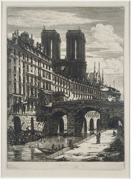 Editor: This is Frank P. Whiting’s "Notre Dame—Paris," an etching from the 1940s. The detail is incredible! There's something almost dreamlike about the reflection in the water. How do you read this work, especially considering its historical context? Curator: This etching compels us to consider architecture as a symbol of power, both religious and national. The Notre Dame cathedral, deeply rooted in medieval history, becomes a focal point for discussions around cultural identity. Given that this was created in the 1940s, the shadow of World War II looms. Does this portrayal romanticize a past while Europe was embroiled in conflict? How might its creation during wartime inform our reading of it today, especially thinking about nationalism and its intersection with religion? Editor: That's fascinating! I hadn't considered the impact of the war era on its creation. I was initially focused on the technique and the beauty of the architectural details, but framing it within the context of nationalism makes me think about its symbolism in a completely different way. Curator: Exactly. And consider this: the choice of etching, a medium with a long history itself, adds another layer. It speaks to tradition and craft, perhaps even longing for a sense of permanence during a time of intense upheaval. Do you see this piece as simply a landscape, or does it function as a commentary? Editor: I see your point. The meticulousness definitely elevates it beyond a simple depiction of a building. It's more like a statement, maybe about the enduring spirit of Paris. Thanks, I never would have thought of it that way on my own! Curator: Precisely, art invites these connections, enriching our comprehension of its significance in diverse and relevant cultural spheres. Editor: Absolutely. It’s a great reminder to consider the socio-political backdrop while analyzing the aesthetic elements.