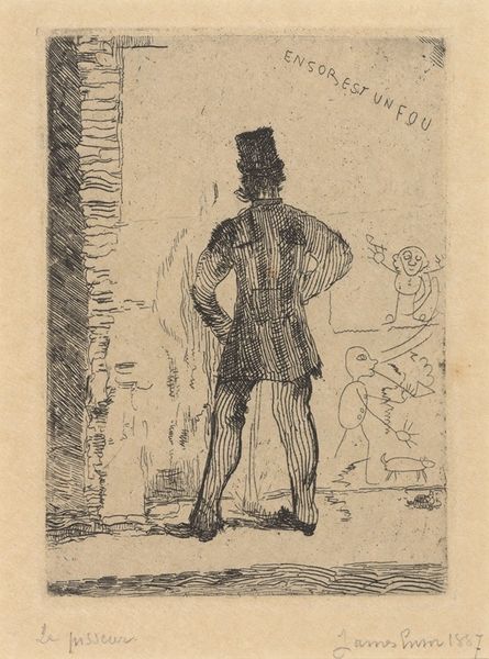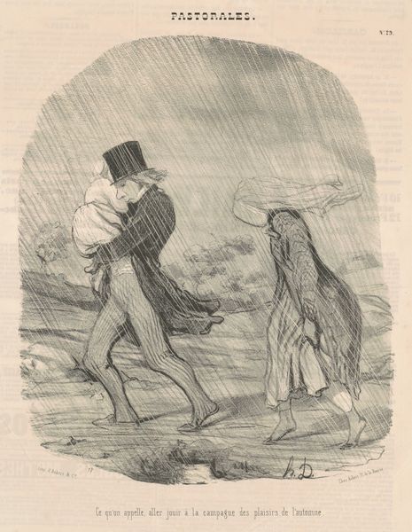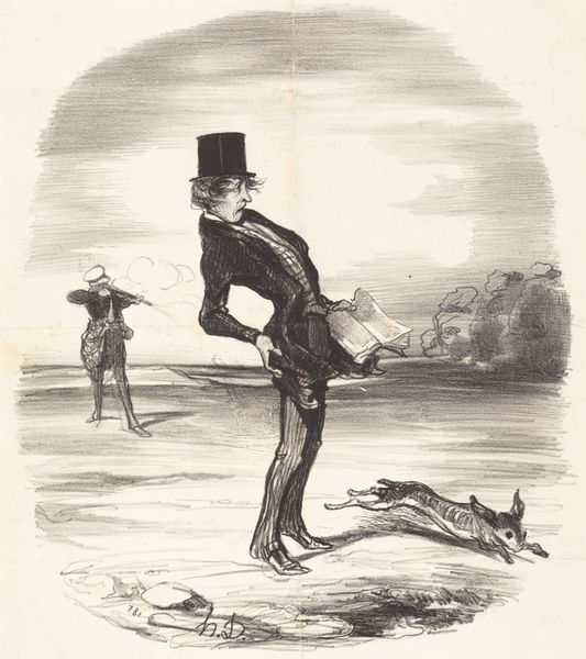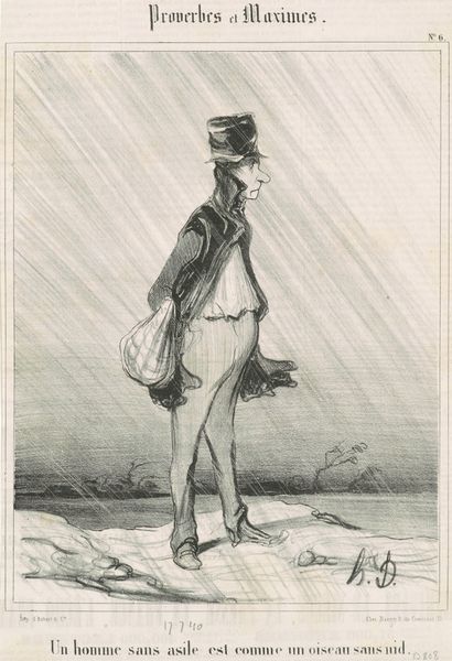 Curator: Here we have Honoré Daumier's lithograph, dating from the 19th century, titled “Inconvénient d'être trop sentimental ...”. Editor: What strikes me immediately is its understated yet quirky tone. There’s a subdued energy, and the light pencil work gives it an almost dreamlike quality. The high-contrast monochrome scheme underscores this mood. Curator: Note how Daumier uses implied lines, creating movement and drawing our eyes across the scene. The composition is asymmetrical; the negative space surrounding the main figure throws his looming shadow into stark relief. Editor: That shadow certainly carries symbolic weight, doesn’t it? Shadows often stand for the unconscious, repressed aspects of our nature, suggesting this sentimental man's darker counterpart is trailing him. Or maybe it's a playful warning that such deep feelings can have hidden consequences? Curator: I’m more interested in the interplay between light and dark in purely formal terms. Notice how the crisp outlines of the man in the foreground contrast sharply with the dissolving figure peeking behind what appears to be a wall. Editor: That second figure certainly creates an intrigue. The wall acts as a screen—suggesting social or psychological barriers that hide parts of ourselves from others, or from the full "moonlight" of emotional experience. He may signify a lack of commitment, or an antagonist. Curator: Fascinating analysis. However, focusing solely on semiotic analysis distracts from understanding the pure craftsmanship evident in the confident lines. And, how the forms interrelate. The artist deliberately teases out the optical tensions in play. Editor: Perhaps, but such technical proficiency often serves to enhance the symbolic resonance. It is this layering of the technical with the thematic that gives artworks enduring power. By playing with our common knowledge about moonlight and emotions, the lithograph hints at our shared human experiences. Curator: True enough. It seems a formalist perspective does, invariably, come back to questioning themes, and what meanings one may extrapolate. Editor: Ultimately, this piece shows that deep feeling is a shared, complicated facet of human experience; where emotional walks, and the night are seldom undertaken alone.