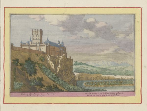 Editor: Here we have "View of the Rear of El Escorial," a watercolor drawing by Pieter van den Berge, dating sometime between 1694 and 1737. The building looks so monumental, dominating the landscape, yet the colours are delicate. How should we interpret that contrast? Curator: Well, consider the socio-political context. El Escorial was not just a monastery; it was a symbol of Habsburg power and Catholic orthodoxy during the Spanish Golden Age. Van den Berge, working much later, presents a view from the rear, softening that overt power. Do you think that perspective diminishes the symbolic weight of the building? Editor: That’s interesting! The rear view almost feels like an invitation to consider what’s *behind* the facade, perhaps even critique it. So the location and time the work was created shapes how people perceived it, which then shifts our reading. Curator: Precisely. These landscapes were often commissioned and circulated as visual propaganda. Even what looks like a straightforward depiction contains layers of intended meaning and subtly changed in time. Does knowing that change the way you see the small figures populating the foreground? Editor: It does! They’re almost dwarfed, and knowing that it’s the “rear” view adds a dimension. Instead of reverence, perhaps there’s a commentary on the disconnect between the powerful and the everyday. Curator: It suggests a tension, doesn’t it? Landscape becomes a stage for considering those relationships of power, rendered accessible through the medium of watercolor. Editor: I'd never considered the landscape as political critique quite so directly. Curator: It's a good reminder that art, especially public art or widely disseminated imagery, always plays a role in broader social and cultural narratives. The question is to look beyond the aesthetic into the context in which it emerged. Editor: It's amazing how seeing a work in its historical setting allows you to unearth hidden perspectives and layers of meaning. Curator: Indeed, context allows us to recognize a seemingly objective view may, in fact, embody social discourse and shifting interpretations across time.