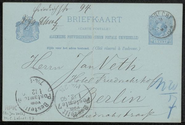This briefkaart to Philip Zilcken, created by Hélène van Goethem, contains symbols of state authority. We see the Dutch coat of arms, an emblem of national identity and power, carefully stamped alongside the monarch’s profile on the postage. These symbols are not merely administrative; they evoke a deep connection to history. Coats of arms, like this one, have roots in medieval heraldry, where symbols identified noble families and their territories. Similarly, the use of a monarch's image on currency and stamps is a tradition that conveys stability. The image of a sovereign, like the crown itself, is a recurring motif throughout history, used to legitimize power. Such symbols touch upon our collective memory and the subconscious associations we hold with authority. The presence of these symbols on a simple postcard transforms it into a small but potent artifact of its time, reflecting the complex interplay between personal communication and state power. These symbols have persisted through centuries, constantly reshaped by changing contexts.