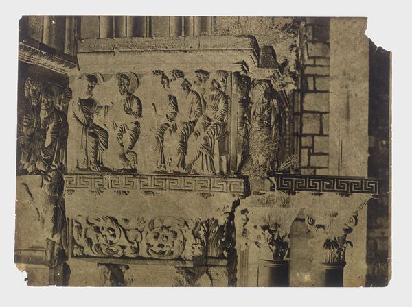 Editor: So this is Charles Nègre's "Bas-relief aan de kerk van Saint-Gilles-du-Gard" from 1852, held here at the Rijksmuseum. It's a photograph of a relief, so it has this interesting layering of mediums. I'm really struck by how it captures a sense of ancient history. What do you see in this piece that speaks to you? Curator: Beyond the obvious classical references, I see Nègre engaging with questions of power and representation. The bas-relief itself likely depicts a procession, a display of social order, but who gets to be included in that narrative, and who is excluded? Editor: That's a great point. I was focusing so much on the style, I didn't consider the content as critically. So you are saying that it prompts questions about historical narratives of inclusion and exclusion? Curator: Precisely. Think about who commissioned the original relief. What message were they trying to send? And then, consider Nègre’s choice to photograph it, at a time of intense debate about the role of the Church, and the state’s increasing colonial power across the globe. It becomes an image layered with historical commentary. It asks: what is being memorialized, and for whom? Is it only for a certain class or a specific race? Editor: Wow, I hadn't considered the colonial aspect. Now, looking at it again, the figures almost seem burdened by the weight of history, trapped in this procession. Curator: Exactly! Photography at this time was about asserting a certain truth. The choice of this relief forces us to question that. Are we seeing the church how it wants to be seen? Or how it truly functions within systems of domination? Editor: This really changes how I see the piece. It’s not just a historical document but a critical engagement with power dynamics. I'll definitely need to spend more time reflecting on that relationship. Curator: And consider how photography itself—the act of capturing and framing—can perpetuate or challenge existing power structures. Editor: I appreciate your perspective on this image and will take it into consideration for other pieces I encounter in the future. Thank you.