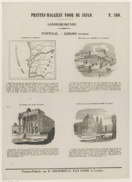 Curator: This is a print entitled "Portugal. - 3,500,000 Inwoners", dating back to 1850. It seems to be by Jan Schuitemaker. The piece combines a map, architectural renderings, and text. Editor: Immediately, the layout gives the impression of a well-ordered, albeit slightly crowded, geography lesson. I see architectural forms – idealized temples and cityscapes, rendered with fine detail. The sharp contrast in the engraving emphasizes permanence and history. Curator: It’s a fascinating glimpse into how nations presented themselves in print at that time. The graphic arts provided visual propaganda to cultivate a sense of national pride, wouldn’t you agree? It combines geographical awareness with monuments of power and cultural achievement. Editor: Indeed, note the engraving itself – this medium speaks to mass production and dissemination. Each line is deliberate, creating reproducible images on a substantial scale, and affordable to many. Consider also the social context – where and how would such a print have been consumed? Curator: These Neoclassical structures chosen for depiction also point to specific values of the time. Look at the Temple of Diana – it reflects back to the roots of classicism and ideas of an idealized past of Western Culture. What did that symbolism represent to people at the time this was created? Editor: Absolutely. Moreover, I find it interesting how the means of representation contribute to that idealization. Engraving allowed for a meticulous level of detail, almost a celebration of precise technical skill which is a core ideology that was embraced during industrialization in many ways. The choice of subject reinforces an intended feeling and impact. Curator: That precision mirrors an ambition towards systematized knowledge, aligning neatly with the emerging disciplines of geography and history in education. Each element works to impart a certain…grandeur to Portugal, don’t you think? Editor: Agreed. Considering the materiality and production behind it deepens the visual impact that continues today. It speaks to specific processes during 19th century print production, reaching many potential consumers. Curator: Yes. Looking at it now, the combination of text and image feels almost proto-infographic in some ways! This format creates layers that shape historical narrative through carefully selected symbols and representations of power. Editor: Definitely food for thought about image making and how prints impacted the consumption of information in Europe.