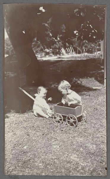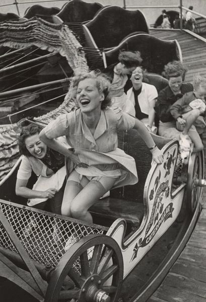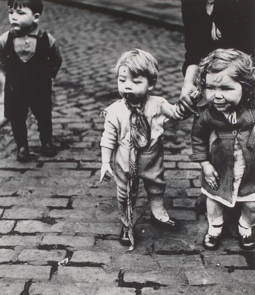 Curator: We're looking at William Klein's gelatin silver print, "Boy + Girl + Swing, New York," believed to be captured sometime between 1955 and 1989. Editor: The contrast! The harsh blacks and stark whites... It almost feels confrontational, like an intrusion on a candid moment. There's a certain rawness. Curator: Indeed. Klein's work is characterized by such directness. Notice the composition. The boy, seemingly mid-scream on the swing, occupies the upper half, almost cropped off. And then, the girl below. Editor: Her dress looks handmade, perhaps reflecting the limited access to manufactured clothes for families. I think it speaks to a post-war material landscape, and those scuffed shoes... that's life lived in public. It’s interesting to consider the labor involved in raising children within a bustling metropolis, where the act of play is visible. Curator: Yes, it complicates that immediate sense of youthful freedom. The graininess, deliberately unrefined, adds to this effect. Klein disrupts any notions of the perfect, staged image. Editor: The photograph's materiality interests me most. Gelatin silver prints became dominant through the mid-20th-century due to their relative cheapness and speed of production. What appear as aesthetic choices also mirror pragmatic constraints faced by artists then. It’s interesting that an industrial method could capture such unique human feeling. Curator: The tilted angle certainly breaks convention and introduces dynamism to a seemingly static scene. One is made aware of one's looking, one is drawn in for questioning. Editor: Definitely, I am also thinking about this space between candid capture versus constructed realities. Perhaps this can be further considered via an engagement with Klein's overall intentions around accessibility in production during the 20th Century. Curator: A valid consideration, focusing then, also on what might otherwise go unseen. Editor: Absolutely. There is depth and a need to rethink how the image was put together in relation to material histories.