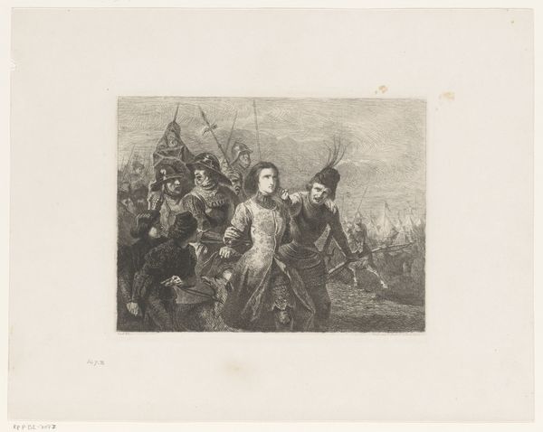 Editor: Here we have Adolphe Alexandre Dillens' engraving from 1851, “Jeanne d'Arc wordt door soldaten gevangen en meegevoerd” depicting Joan of Arc's capture. It’s interesting—even in a moment of defeat, she looks so resolute. What stands out to you in this print? Curator: For me, it's all about the contrast. You’ve got Joan, stoic and dark, almost swallowed by the shadows. But around her? This swirl of chaotic figures, full of wild energy, a baying pack really. Dillens, I think, wants us to see not just a historical moment, but the tragic collision of individual courage against the overwhelming tide of… well, of humanity, really. What do you make of that contrast? Editor: I see what you mean about the contrast. The crowd is a really striking visual element, drawing focus. So, what is Dillens trying to tell us about Joan's story? Curator: That’s the million-dollar question, isn’t it? Maybe it's about how easily heroes are consumed by the very people they fight for. Or, maybe Dillens saw something of his own time reflected in her story. The 19th century was pretty turbulent after all. He’s not just showing her capture. Editor: That is a point, capturing more than a specific event. So much of the story hinges on those surrounding Joan, or at least how Dillens imagines them. Curator: Exactly! They're not just extras, they're crucial. Do we cheer for her? Do we boo the rabble? I am really thinking that this scene is about our tendency to make – and break – our heroes. What do you think? Editor: Definitely something to consider. I guess that looking closely has encouraged me to move beyond the image's surface and see the tension and narratives beneath.