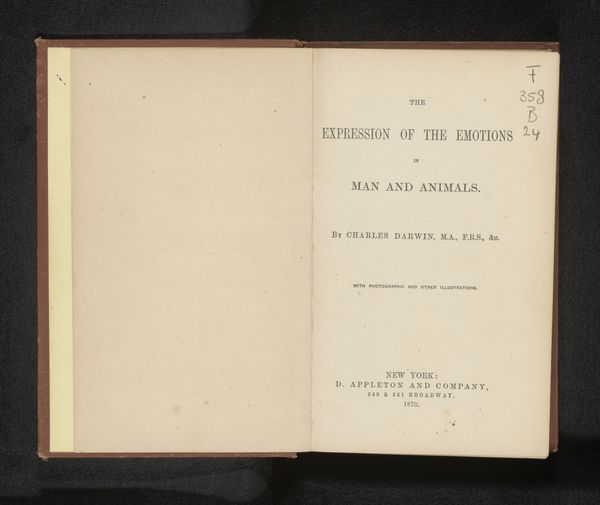 Editor: Here we have "The Expression of the Emotions in Man and Animals" by Charles Darwin, from around 1872. It appears to be a print on aged paper. There's something fascinating about seeing the actual book, it feels so tangible. What jumps out at you when you look at it? Curator: What I find compelling is understanding how Darwin positioned this work within the visual culture of the late 19th century. He wasn't just presenting scientific data; he was consciously engaging with debates about psychology, expression, and the very nature of being human and animal, using the printing press for wide distribution. Consider how photography was changing ideas about realism and representation. Editor: So, he's using a relatively new medium – photography– to back up his theories? Curator: Precisely. But more than that, think about the *politics* of emotion. Whose emotions were considered valid, civilized, worthy of study? The book implicitly reinforces some social hierarchies even as it challenges others by comparing human and animal expressions. How do you think the public received this interplay between science and social norms? Editor: I never thought about it like that. It's not just about science, it's about what society valued and accepted at the time. Curator: Exactly. And books like this played a role in shaping those values. Looking closely at a printed object also offers a lens to consider how the burgeoning publishing industry democratized access to both information and visual rhetoric. We take mass media for granted now, but consider the cultural impact in 1872! Editor: It's amazing to consider that what seems like a straightforward scientific book was part of larger conversations about society, class, and even who gets to be considered 'civilized.' Thanks, this gives me a totally new way to understand the work. Curator: Indeed. It highlights that objects, especially printed matter, carry with them complex historical contexts that still resonate today.