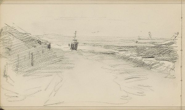Curator: Maurits van der Valk’s 1928 drawing, simply titled "Strand," invites us to contemplate a vast coastal landscape. Executed en plein-air, it’s rendered on paper. Editor: The overwhelming feeling is of emptiness, a kind of serene isolation. The muted palette reinforces this, everything blending into a homogenous plane. It almost feels like looking at the dawn of time, that sense of elemental stillness. Curator: Precisely! The restricted color scheme, largely dominated by beige and pale gray, contributes to the overall flatness. Observe how Van der Valk uses subtle tonal shifts and delicate lines to suggest form. It teeters on the edge of abstraction, but the structure remains deeply realist in nature. Editor: There’s a poignant, almost elegiac quality. The figures—birds, I think, rendered very small on the expansive shore—highlight a relationship between fragility and the sublime forces of nature. These recurring images of shorebirds evoke, perhaps, an enduring spiritual connection to coastlines, places of transition and reflection in so many cultures. Curator: An astute observation. His handling of light and space, especially within the receding plane of the beach, subtly destabilizes traditional perspective. This is heightened by his restrained rendering of detail and form. Note how the flatness pushes against perceived depth. Editor: What lingers with me is this image’s emotional restraint. Its stark emptiness seems so evocative, conjuring an introspective mood. Its quietude allows room to consider symbols from varied myths connected with shores: transformation, contemplation, cleansing. Curator: Indeed. It’s precisely within that tension—between restraint and emotional resonance—that this landscape becomes deeply compelling, creating, simultaneously, structure and mood. Editor: For me, that open space invites each person’s narrative, their memories. Curator: The interplay of formal devices achieves just that!