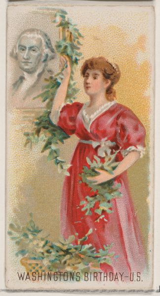 Editor: Here we have "Ceres, Goddess of Agriculture," a print from 1889 by William S. Kimball & Company. It reminds me a bit of an advertisement; it's so clean and the colors are so carefully chosen. How would you approach this piece? Curator: Considering this print through a materialist lens, it becomes intriguing. Produced by Wm. S. Kimball & Co., primarily a tobacco company, the image served as a trade card inserted into cigarette packs. It makes me wonder about the mass production techniques, the specific inks and papers used, and how those materials contributed to its function as a marketing tool. Editor: So you're saying that even the physical materials had a specific purpose, to get people to buy cigarettes? Curator: Precisely! And we should consider the workers who produced these cards. What were their labor conditions like? How did the manufacturing process affect the environment? It invites questions about consumption, waste, and the industrialization of art and image production. It asks if it even _is_ art. Editor: I hadn't considered it that way, it is very interesting to me how these materials contribute to something far greater than the image they hold. Thinking about the resources that had to go into such small things that people could just throw away is, frankly, a little frightening. Curator: Yes, it shifts the focus from the idealized image of Ceres to the socio-economic context of its creation. I am delighted that my view helped you to have such realizations.