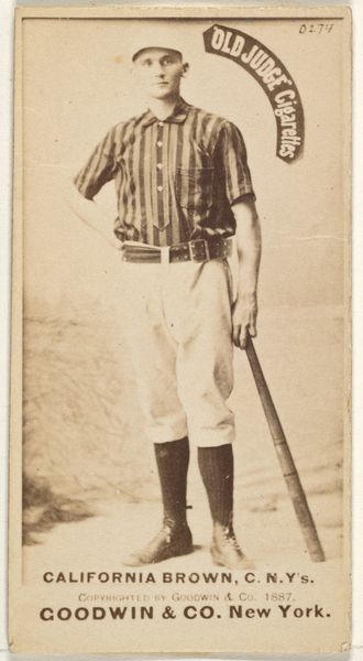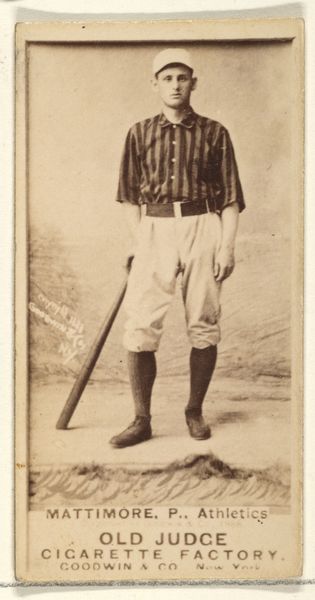 Curator: This is a baseball card from the Old Judge series, created by Goodwin & Company in 1888. It features Patrick J. Murphy, a catcher for the New York team. Editor: Oh, wow, it has this sepia-toned softness. It's faded but there's something noble about him—a real old-timey swagger with that bat and the mustache! It is an aesthetic, for sure. Curator: Precisely. The card is a print, derived from a drawing. It circulated as an insert in Old Judge Cigarettes, a fascinating example of early advertising. It really reflects how images get attached to meaning, especially those of virility. Editor: Tobacco and baseball – classic. I mean, you see the brand linking itself to that hyper-masculine energy of sport! Plus, I am wondering who Old Judge even is? What archetypes are at play here? Curator: Right. In those times, this form of mass reproduction would also create almost instant recognition, establishing popular icons for emulation. Murphy and other athletes become instantly known symbols. This card is an artifact loaded with the cultural associations of that era. Editor: I dig the kind of unintentional rawness of the design; a simple portrait, pretty straightforward font. I keep seeing his outfit as iconic – how baseball uniforms were less about performance and more about making players look heroic. He does look pretty stoic. Curator: Consider the Old Judge brand name. Law, judgement, but then you get an implied seal of approval—linking Murphy’s perceived values as an athlete and citizen, to smoking cigarettes. You get these assumed links as if morality transfers from one element to the other. Editor: That really brings together both cultural zeitgeists: smoking, tobacco, baseball! Today's ads, though, are much more insidious with the manipulation. But this, it just presents him. Maybe with nostalgia, he kind of glows! Curator: I think that glow comes from the layering of symbolic values that coalesce in the image – the sport, health, social class, location – these are all symbols and meanings contained in a rectangle of paper. It creates a little pocket of history and longing. Editor: Makes you think, what everyday image today might become some precious historical artifact in the future! Thanks for sharing this blast from the past.