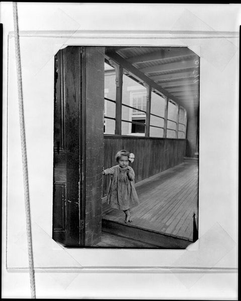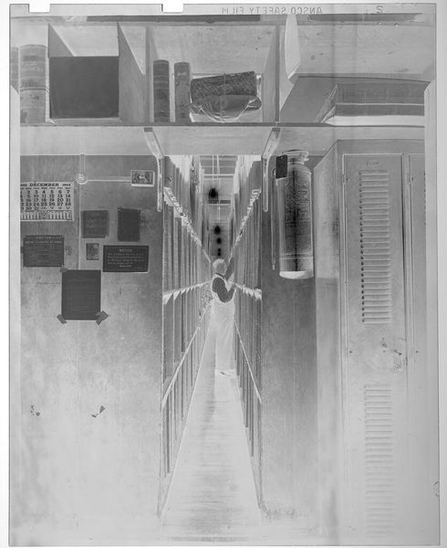 Editor: This photograph, titled "Untitled (boy looking in school locker, nun in school hallway)" by Jack Gould, presents a striking scene. The long hallway receding into the distance really gives a sense of loneliness. What do you make of the nun's presence alongside the boy? Curator: It's a captivating juxtaposition, isn't it? The nun, a figure of tradition, stands starkly in this liminal space. She's framed within this almost sterile, institutional environment, creating a kind of dreamlike unease. The boy, seemingly absorbed in the quotidian task of opening his locker, is almost oblivious to her. Is it a commentary on faith, societal roles, or perhaps just a beautifully captured moment of everyday surrealism? Editor: I see what you mean. The composition definitely amplifies that sense of isolation, for both of them. Curator: Exactly! Gould masterfully uses the negative space to heighten the feeling of separation and introspection. I keep wondering, what's in that locker? Editor: That's a great point! It makes you think about secrets and hidden parts of ourselves. Curator: Right? It’s the art of the unsaid, I think.