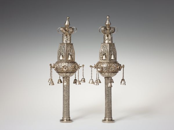 Curator: I'm struck immediately by the sheer formality of these objects. There's a rigidity, almost a stateliness, in the contrast between the lustrous brass and the stark wrought iron. Editor: Indeed. What we’re observing here are andirons, dating back to the 17th century. Though crafted by an anonymous artist, this decorative-art sculpture serves a distinct function. Andirons, sometimes called firedogs, were placed in hearths to support burning wood. Curator: Ah, a functional object elevated by ornamental excess! Notice how the bulbous brass finials rest atop fluted sections and sturdy tripods. The structure is essentially a study in stacked geometric forms: sphere, cylinder, and so on. Editor: These andirons, like many decorative objects from that period, tell us a great deal about social class and aspiration. To have the resources to embellish something as basic as a fire support spoke volumes. Homes transformed into sites for artistic display, didn't they? Curator: Absolutely. And the surface play is significant, consider how light interacts with the brass, creating a soft glow in contrast with the shadow absorption of the wrought iron, enhancing their visual prominence against the flames in the hearth. Editor: In today's setting at the Minneapolis Institute of Art, their historical context might be slightly obscured. Consider them as integral elements in defining power dynamics of the 17th-century home, reflecting the period's economic disparities and social performance through art. Curator: I find myself admiring the visual rhythm. The repeated shapes establish a dialogue. In this case, each individual unit exists only by relation to another. Form follows function, then transcends it through careful placement and material contrasts. Editor: True. These andirons now spark contemplation in a gallery setting, and invite reflection on their cultural journey—from functional fixture in an elite household to admired object within a museum context. They demonstrate, if nothing else, art's enduring role in storytelling.