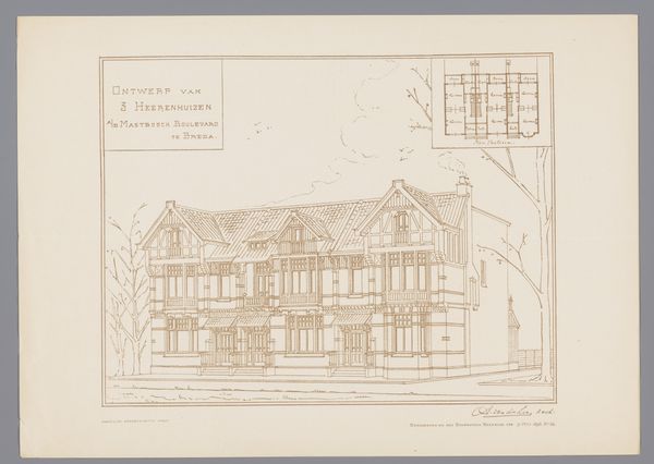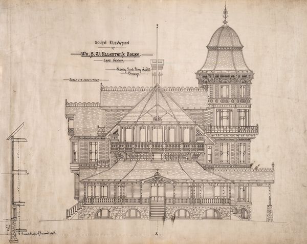 W. Strong created this design for a house, south elevation, using graphite on paper. The precision and detail speak to the conventions of architectural drawing, a practice that blends technical skill with artistic vision. The crisp lines and careful rendering emphasize the house's form, texture, and scale, presenting it as a buildable reality. The design reflects a specific social context: the late 19th century's fascination with elaborate domestic architecture, showcasing a rising middle class eager to display its prosperity. The intricate woodwork, the turret, and the multiple gables all signify affluence and taste. Consider the labor involved, not just in the drawing itself, but in the construction this design would inspire. From lumber mills to brickyards, numerous hands would contribute to bringing this vision to life. Looking closely at the drawing reminds us of the deep connections between design, material, and the broader world of labor and production. It challenges us to see architecture not just as art, but as a product of complex social and economic forces.