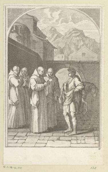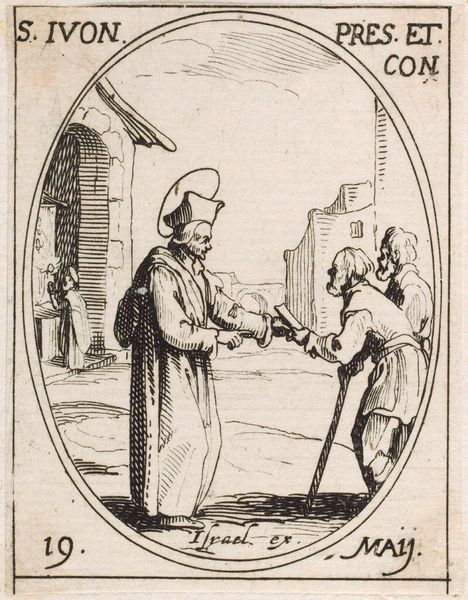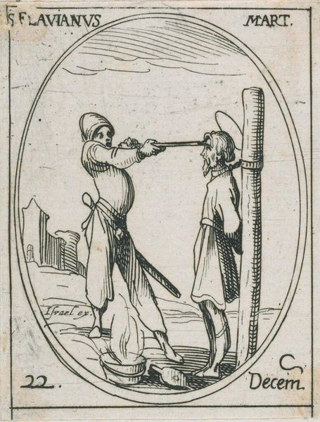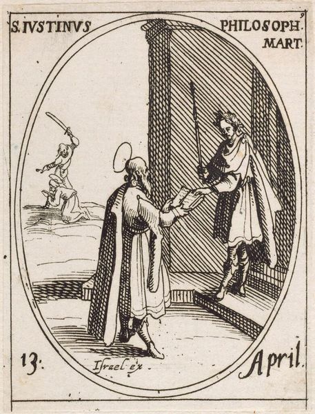 Curator: This engraving, "H. Cantianilla," produced between 1565 and 1630, hails from the hand of Antonio Tempesta, a master of the Italian Renaissance, and resides here at the Rijksmuseum. Editor: Gosh, talk about tension! It’s spare, but something about that stark composition makes me a bit uneasy. I sense some impending doom! Curator: A pertinent interpretation, given the narrative at play. Notice how the linearity of the engraving, typical of Tempesta's style, emphasizes the dramatic weight of the moment. The precise rendering creates a stark visual and emphasizes form. Editor: Right, and the framing! That serpentine border almost seems to trap the scene, magnifying the subject and heightening the feeling that we are flies on the wall—like an invitation to witness this dark act. It lends to a rather suffocating feel, doesn't it? I think I am going to be a vegetarian forever. Curator: Precisely. The composition guides our eyes deliberately, making the figures central, almost forcing us to analyze their pose and engagement. The details, even within the constraints of the medium, invite our exploration. Editor: I’m really drawn to how that brutal, straight sword clashes with the almost resigned posture of the woman. Her face is a shadow and has an unworldly acceptance of her own destiny. This resonates really deeply with the complex and sometimes gruesome history embedded in Renaissance art. Curator: Absolutely. Through that formal starkness, the engraving distills a complex historical narrative into a digestible image that carries considerable emotional weight and artistic intent. Editor: What a potent little package. To think a simple print could harbor so much raw narrative power and compositional strength. Curator: Indeed. In essence, "H. Cantianilla" is a testament to Tempesta’s sophisticated control of form and an understated narrative art.