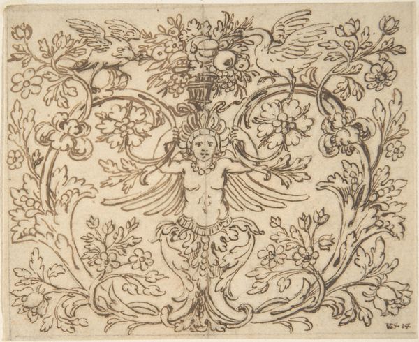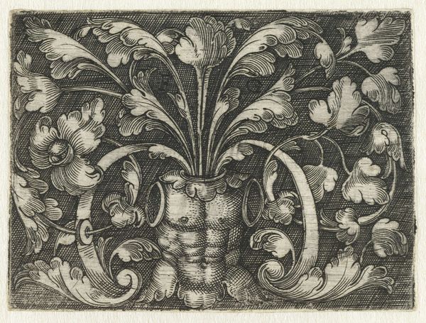 Curator: Instantly, I see order. This print, entitled "Horizontal Panel with Scrolling Tendrils Growing from Center," has such clear organization. Editor: Organization? It's almost oppressively symmetrical! My eye bounces around searching for a point of release, but those spiraling tendrils just keep pulling me back in. It's beautiful, of course, but maybe a tad…uptight? Curator: The engraving, dating to about 1530-1540 and created by Heinrich Aldegrever, exemplifies Northern Renaissance linearity and design. Observe the rigorous repetition and bilateral symmetry governing its structure. Editor: Exactly! Each frond a mirror image. Where's the wild abandon, the unpredictable blossoming? Still, you have to admire the artist's command over the engraving process. Look how precisely those lines define each leaf's contour! Curator: Indeed. The medium serves the message. The rigid control of line and form underscores the prevailing aesthetic preference for order and clarity during the Renaissance. Notice the dense, cross-hatched background against the smoothness of the leaves. Editor: The use of engraving brings forth almost an architecturally organic structure! You have vertical stems supporting horizontal leaf structures. Curator: Precisely. One can consider the underlying intellectual project that aims to synthesize classical ideals with contemporary forms. We see this geometric grounding of nature during this era, a push and pull that creates a pleasing visual tension for modern eyes, wouldn't you agree? Editor: Well, I still yearn for a touch of imperfection! However, seeing Aldegrever's technique alongside that conceptual rigor, I do gain an odd satisfaction from its very restraint. Curator: Agreed. Examining the structure gives one pause for the beauty and skill demonstrated here, revealing deeper questions of balance and artistry in rendering botanical themes in a period of both intense artistry and strict social hierarchies.