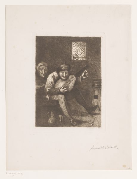 Editor: This is "Luitspeler stemt zijn instrument," or "Lute Player Tuning His Instrument," an etching made by Albert Van Holsbeeck between 1887 and 1912. The texture seems so rich for a print; I’m curious about what we can unpack regarding the context around it. What can you tell me about this artwork? Curator: I see an etching, fundamentally a *reproducible* artwork, depicting leisure – the production of music, perhaps even performance for an audience implied by the second figure. It draws attention to how such leisure activities become accessible and disseminated. We must consider the socioeconomic implications: Who produced this etching, and for what market? Editor: That's interesting. So, rather than focusing on the scene itself, you’re drawn to the way the image was made and how that might have impacted its availability? Curator: Exactly! The means of production—the etching process, the paper quality—speak to its potential reach and target audience. Was this meant for the masses or a select, affluent group? Furthermore, consider the materials used. The etcher's labor in producing multiple impressions invites us to analyze the art market dynamics of that time. Editor: You’ve made me think about it from a totally different angle, less about who is depicted and more about who this print was for and how it circulated! Thanks! Curator: Indeed! Reflecting on the interplay between art production, materials, and the cultural economy unveils hidden narratives within this seemingly simple genre scene.