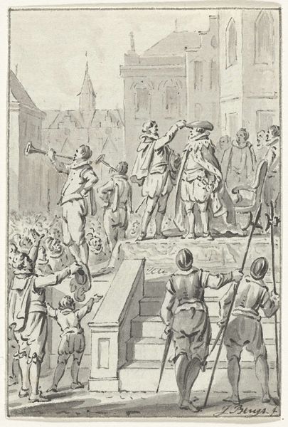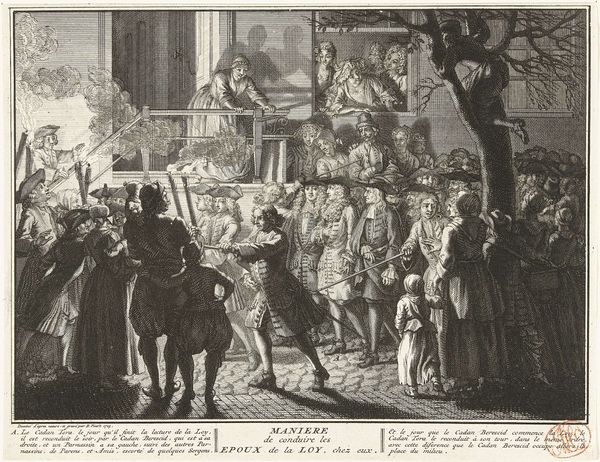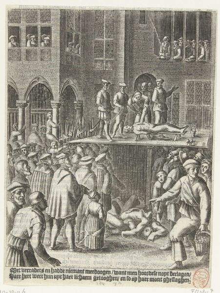 Editor: This engraving, titled "Terechtstelling van de wederdopers op het schavot op de Dam, 1535," was created between 1657 and 1659 by an anonymous artist. It’s quite graphic, depicting an execution in what looks like a town square. I am immediately struck by the clear composition dividing the spectacle above from the observing public below. What formal elements jump out at you? Curator: Immediately, the intricate linework arrests the gaze. Consider how the density of the engraving modulates—more compact and precise in the architecture of the building in the upper-left corner, and gradually loosening toward the crowd. Note, too, the orthogonals of the building's facade that draw the eye upward, culminating in the disturbing spectacle taking place at the center. Observe the relationship between light and shadow; they amplify the spatial depth and volume. It begs the question, is it more about light or the figures within? Editor: So, it's more than just a historical record; the artist used technique to direct our attention and perhaps create an emotional response? Curator: Precisely. The artist employed compositional structure to create a deliberate viewing experience. The interplay of horizontal and vertical lines within the architectural setting contrasts sharply with the organic shapes of the figures, contributing to the overall tension. Observe how the textures, rendered through the engraver’s meticulous hatching, animate the scene. Consider how each small mark, strategically placed, helps compose and construct the images we recognize. Is the artist trying to portray an emotion or just recreate what they saw? Editor: It makes you consider how the method changes how we see something awful. Curator: Precisely! Reflecting on the intricate web of lines and compositional arrangement offers deeper engagement. Editor: I am now interested in seeing how different eras adopted various media in their response to conflict. Thank you.