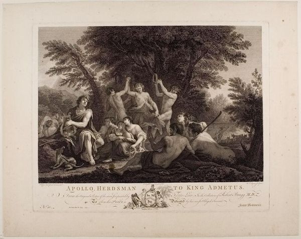Curator: Gaspard Duchange created this engraving, Diana and Her Nymphs Bathing. I'm immediately struck by the central figure's languid repose. Editor: It feels like a stolen moment, doesn't it? The iconic scene of Diana, the huntress, vulnerable and relaxed in her bath. Note the bow and quiver hanging in the tree above. Curator: The placement of the hunting equipment so far above seems almost symbolic of a shedding of her usual power. Bathing is an act of purification and vulnerability. Editor: Absolutely. And the cultural memory of the Diana myth is crucial here. Her purity was fiercely guarded, and any intrusion a grave offense. Curator: It's also worth observing how Duchange leverages the visual power of classical allegory to reflect and reinforce societal structures and expectations regarding female behavior and virtue. It became a charged political symbol. Editor: Looking at it now, I'm reminded of the power these images held, and still hold. Thank you for pointing out its enduring social and symbolic meaning.
