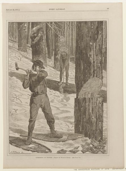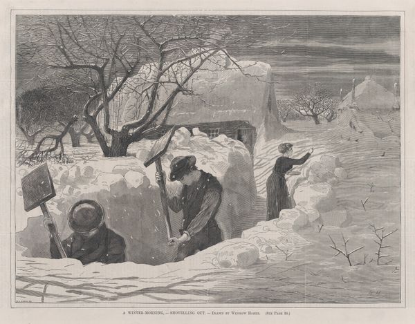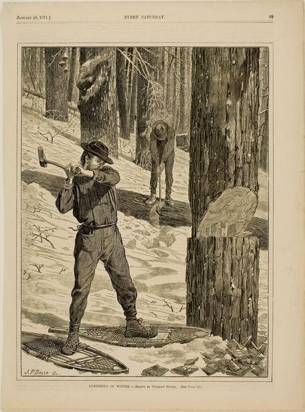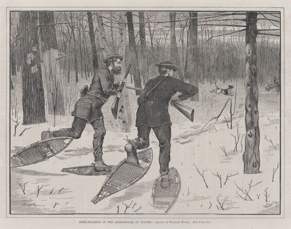 Winslow Homer crafted this print, "Deer Stalking in the Adirondacks in Winter," to depict a hunting scene. The rifle is prominently displayed; we can see the hunters’ intentionality, underscored by the dog in pursuit of the deer, together conveying an assertive dominance over nature. Consider the hunter's stance, echoing the ancient motif of the triumphant hero. We find this pose in classical depictions of gods and warriors, symbolizing power and control. Yet, here, it's transposed onto the American wilderness, reflecting a cultural narrative of man conquering the wild frontier. The act of hunting itself carries complex layers of meaning. It harkens back to primal instincts, to the very origins of human survival. Psychologically, it embodies a drive for mastery and a confrontation with mortality. This image is not just a depiction of a hunt, but a mirror reflecting humanity’s enduring relationship with nature.
