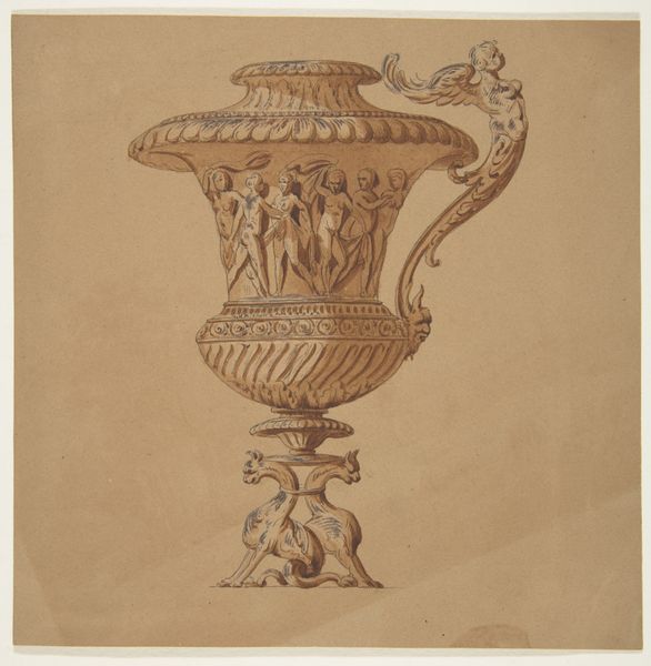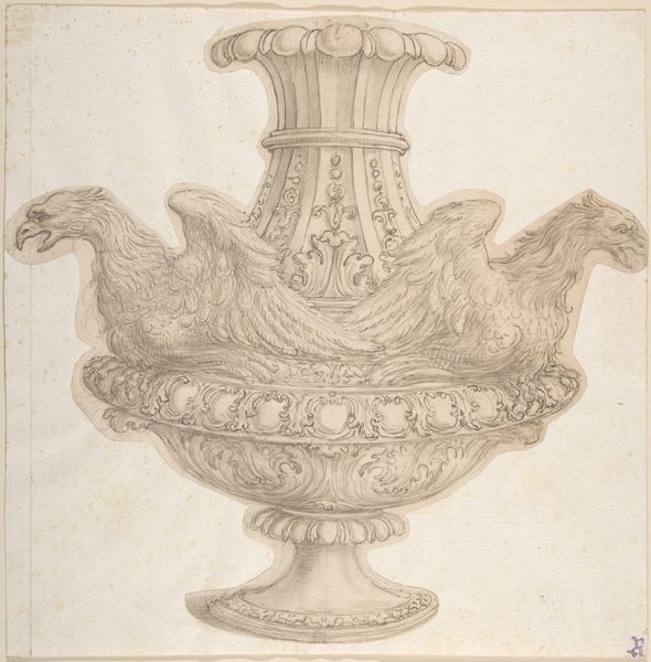 Editor: So, here we have what's called "Design for an Urn with Four Putti in Central Cartouche", an early 19th-century pencil drawing—somewhere between 1805 and 1815—by an anonymous artist. I am immediately struck by how ornate and, dare I say, slightly busy it is. All those chubby little putti! What's your take on it? Curator: Busy, perhaps, but divinely so. Think about it; Neoclassicism adored recovering that "antique" look from centuries gone by, and an urn such as this offered a three-dimensional canvas, brimming with allegory! I wonder: Do those cherubic putti, cavorting with such abandon, hint at deeper aspirations? Is this perhaps a commentary on fleeting innocence, or a yearning for eternal bliss? What do you suppose our artist hoped to evoke? Editor: Hmm, I see your point. The cherubs are kind of…frolicking, aren't they? Not your stoic, Roman figure. But an urn; what purpose did drawings like this actually serve back then? Curator: That’s the question, isn’t it? Is it pure artistic musing, an idle sketch brought to life? Or a design, maybe intended for a grand estate? Perhaps it was meant to hold the ashes of someone dear or underscore the values of the owner, transforming an ordinary item into a symbolic vessel of virtue and meaning! Does this urn hold stories yet untold? Editor: That’s such a wonderfully imaginative consideration to this somewhat muted design. Curator: You know, maybe "muted" isn’t quite right. Perhaps the artist's hand was guided not by mere earthly graphite but by whispers of ancient dreams. Thanks for noticing what is indeed amazing in that pencil work! Editor: Likewise! The prospect of lost stories in a simple pencil sketch, I didn't realize I could dream that up today!