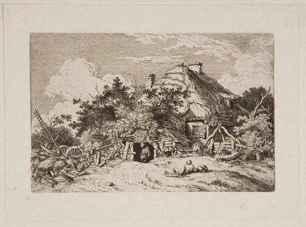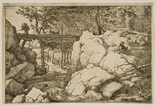 Editor: This is "The Large Rock at the River" by Allart van Everdingen, an etching. I’m really drawn to the textures, the way the lines create such depth. What can you tell me about the materials and process? Curator: The etching process itself is key. Think about the copper plate, the acid, the labor involved. How does this reproductive print democratize or commodify the landscape? Editor: So, the act of making prints changes the way people consume and think about landscapes? Curator: Precisely. It transforms a unique experience into a reproducible commodity, available to a wider market. It makes you wonder about the social impact of images like this. Editor: I never thought about it like that, seeing it more as an object of production and distribution. Curator: Indeed, and that's the beauty of a materialist approach!