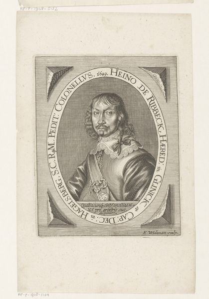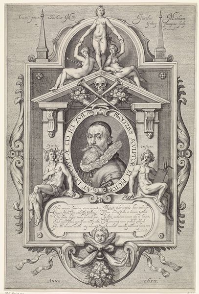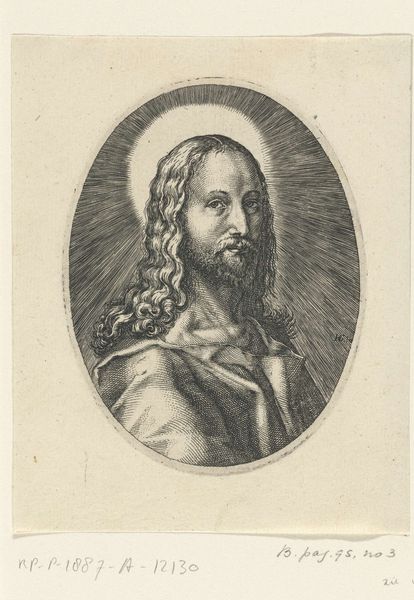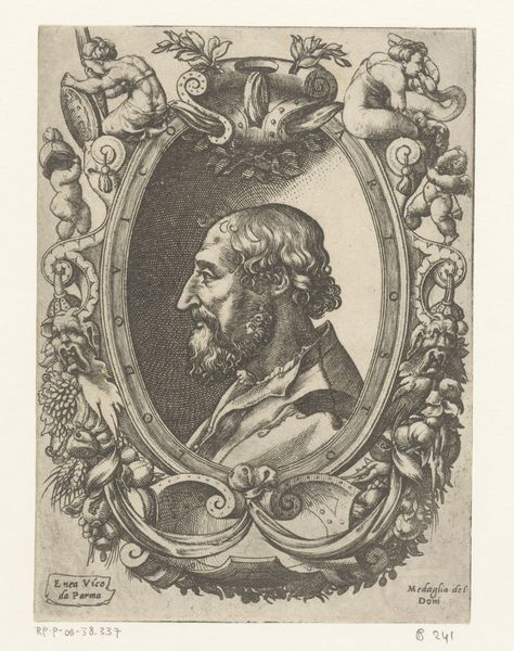 Editor: Here we have Enea Vico's "Portret van Christus," created around 1550 using engraving techniques. The figure is enclosed in an elaborate frame. There's something almost unsettling about the directness of his gaze and the decorative details around him. What strikes you most about this portrait? Curator: For me, the engraving immediately speaks to the turbulent socio-political environment of the mid-16th century. The Mannerist style, with its heightened emotion and dramatic composition, reflects the religious anxieties of the Reformation. Vico’s choice to depict Christ in profile, within such an ornate and somewhat suffocating frame, almost hints at the restrictions placed upon religious expression at the time. Editor: I see what you mean about the restrictions. Do you think the putti and other ornamental flourishes are simply decorative or might they hold deeper significance? Curator: I think we must question those visual choices! The putti, common in Renaissance art, usually represent divine love. However, placing them alongside such a solemn figure raises questions. Are they there to console or to perhaps subtly highlight the complexities and inherent contradictions within religious dogma of that period? Perhaps Vico is using familiar symbols to prompt viewers to contemplate their own evolving relationship with faith. Editor: That’s fascinating. I hadn’t considered the deliberate contradictions in the image. I was too focused on the overall effect and didn't delve deep into each element of the engraving. Curator: Exactly! Art of this period encourages us to interrogate, not just observe. Think of it as a visual argument about belief and its place in society. Editor: This makes me think about how the print, as a reproducible medium, also made religious imagery more accessible. Thanks to our conversation, my perspective of Vico’s "Portret van Christus" has shifted dramatically. Curator: Mine as well! The complexities within the image now make even more sense in the light of mass reproduction, intended for a large, increasingly literate, audience!
