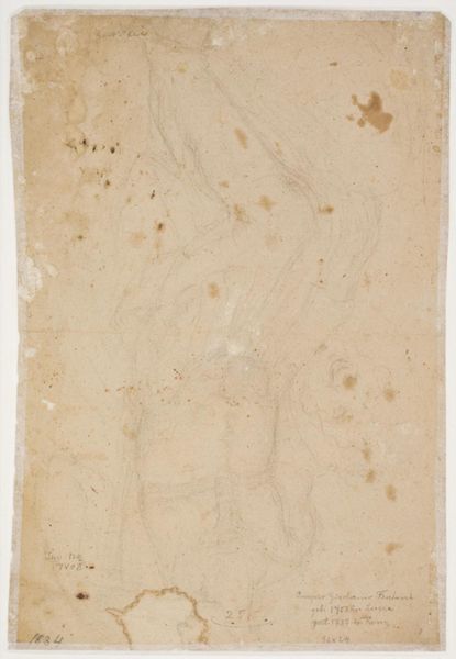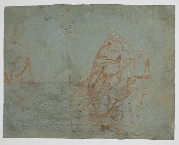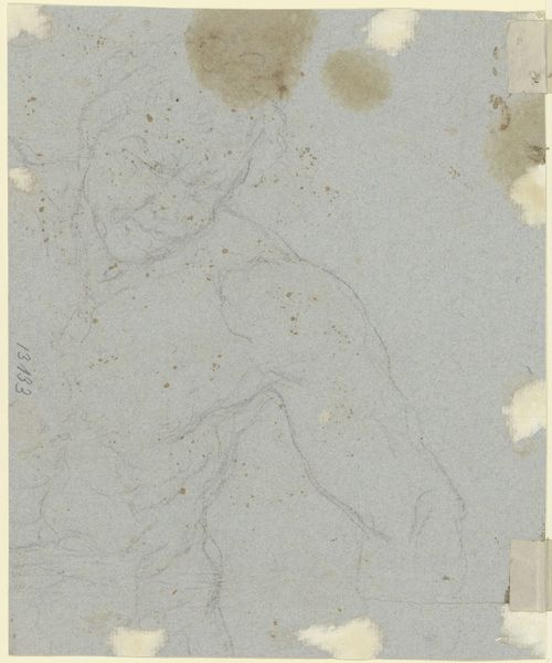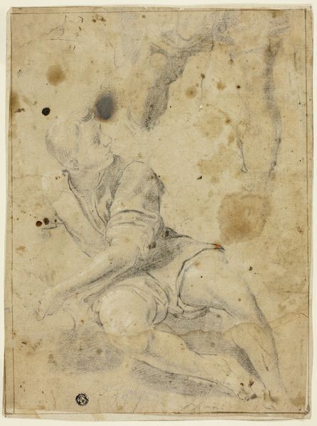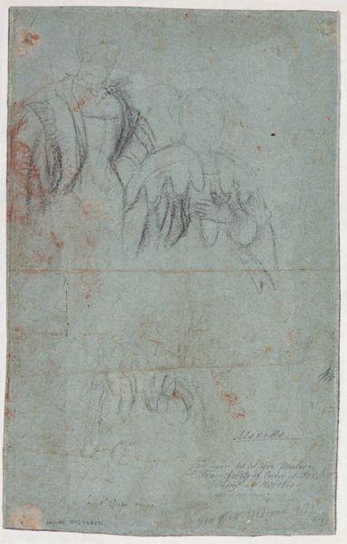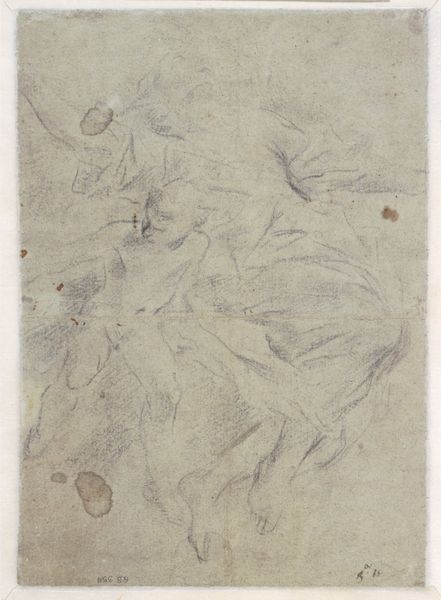 Editor: So this is "Studies of Male Figures" by Giovanni Paolo Panini, made with pencil and chalk on paper. I’m really struck by the… tentative quality of the lines. It feels more like a sketch than a finished drawing. What stands out to you in terms of composition and technique? Curator: Indeed. Notice the strategic deployment of line and shading. How do the density and direction of Panini's lines articulate the figures' volumes, creating a subtle tension between surface and depth? Observe, for instance, how the hatch marks of pencil and chalk articulate the shadows, the lines tracing not only the form but also the direction of light across the depicted forms. Does this contrast between shadow and light remind you of chiaroscuro? Editor: Yes, now that you mention it, the chiaroscuro definitely creates depth and dimension. What about the relationship between the figures? They seem quite separate. Curator: Precisely. The placement of each figure—one standing, one only a partial rendering of a second standing figure, and one seated—creates a fragmented composition, an exercise in form rather than a narrative. Does the academic art of the time shed light on the strategic utilization of studies for paintings? Also, how do you respond to the physical state of the work itself, the age of the paper, and the visual impression left behind by past events and handling? Editor: That's a really interesting point, that these were studies, academic excercises in preparation of other artworks. So the composition is functional. It makes me appreciate the materiality more now - it feels like an ephemeral capture of an exercise. Curator: Exactly. It becomes evident that the true subject of Panini’s labor transcends mere representation. I’m pleased our analysis of technique and composition reframed our perception. Editor: Absolutely. I learned a lot about seeing drawings as artworks on their own. Thanks!