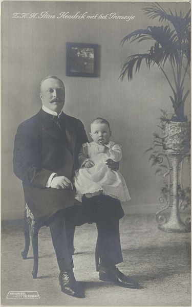 Curator: This photograph, simply titled "Untitled (portrait of three men with young boy and two black dogs)," is attributed to Martin Schweig. It’s a black and white print held here at the Harvard Art Museums. Editor: There's something so charmingly formal about it, even a little bit melancholic. The stiff poses, those serious little dogs – it feels like a bygone era distilled into a single frame. Curator: The image provides a window into the constructed nature of family portraiture, especially within the socio-economic context of the time. The emphasis on attire and presentation speaks volumes about societal expectations. Editor: You can almost feel the silence of the studio, can't you? And those little wall decorations behind the men, they feel almost like little ghosts peeking in. Curator: Precisely. The composition can be interpreted as a reflection on patriarchal structures and the representation of masculinity, as well as the visual construction of kinship and lineage. Editor: It's a moment frozen in time, isn't it? I wonder what stories they carried, these people and their dogs, outside the frame. It makes you ponder family secrets and the weight of expectations. Curator: Indeed, it provokes consideration about how we perform identity and familial roles, even now. Editor: Definitely, thanks for pointing it out!
