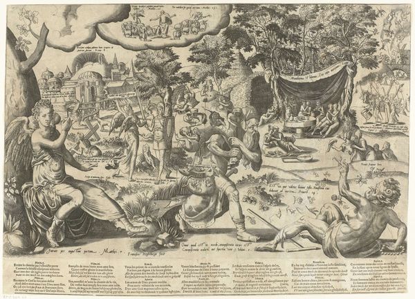 Editor: This is "Plate 1: Cain Killing Abel, from 'The Battles of the Old Testament'" made sometime between 1585 and 1615 by Antonio Tempesta. It's an engraving rendered in ink. It's a rather brutal scene, yet rendered with almost delicate detail in the landscape and the figures. What stands out to you? Curator: Well, consider the context of its production. Engravings like these were commodities. Note how Tempesta efficiently utilizes line work to describe textures – animal fur, human flesh, foliage. The material reality is that this wasn't fine art, but something made to be reproduced and consumed widely. How does the means of production inform our reading of its brutal subject matter? Editor: So, because it was made to be reproduced, it kind of numbs the horror? It's like a factory producing violence. Curator: Precisely. Think about the division of labor involved. Someone designed the image, someone engraved it, someone printed it, someone sold it. This detachment between the artist's hand and the final product affects its meaning. Consider the consumer; What sort of visual repertoire are they assembling in their homes through works like these? Does the image serve a moral or didactic function, or simply cater to a taste for violence? Editor: That’s a good point. It’s not just about the artistry; it's about the entire network that brought this image into existence and the impact it has as a mass produced object. Curator: Exactly. We're looking at not just art, but the industry around it, and how that shapes what the artwork *is*. I find myself dwelling on this image as a tangible testament to early modern anxieties regarding mass culture and availability. How unsettling that access and technology facilitated distribution of this brutal violence... Food for thought! Editor: Absolutely, I hadn't considered that. It shifts my focus from just the biblical narrative to the social and economic forces at play.